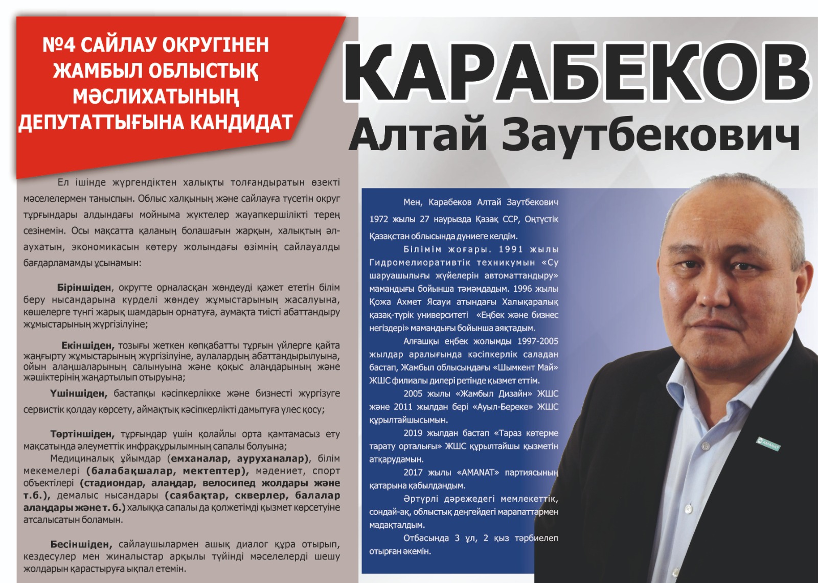 №4 сайлау округінен Жамбыл облыстық мәслихатының депутаттығына кандидат КАРАБЕКОВ АЛТАЙ ЗАУТБЕКОВИЧТІҢ сайлауалды бағдарламасы