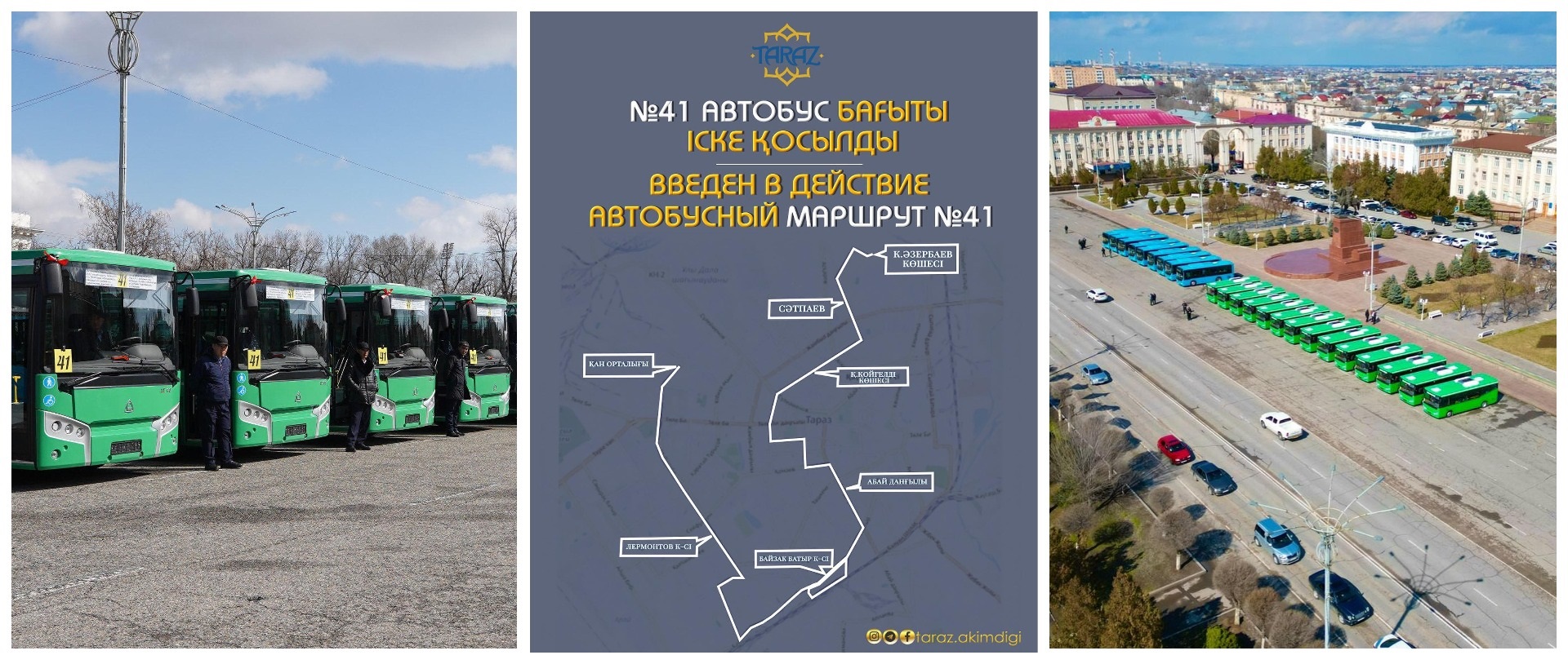 Тараз қаласының тұрғындары үшін №41 автобус бағыты қайта іске қосылды. Аталған маршрут бойынша жолаушыларды тасымалдайтын 12 бірлік автобус енді К.Әзірбаев көшесі, Гидрокешен, Қолбасшы Қойгелді көшесі, Абай көшесі, Темір жол вокзалы, Ы.Дүкенұлы, М.Лермонтов, С.Сейфуллин, Әл-Фараби көшелері арқылы қалалық аурухана, қан орталығына дейінгі аралықта қала тұрғындарына қызмет көрсетеді.