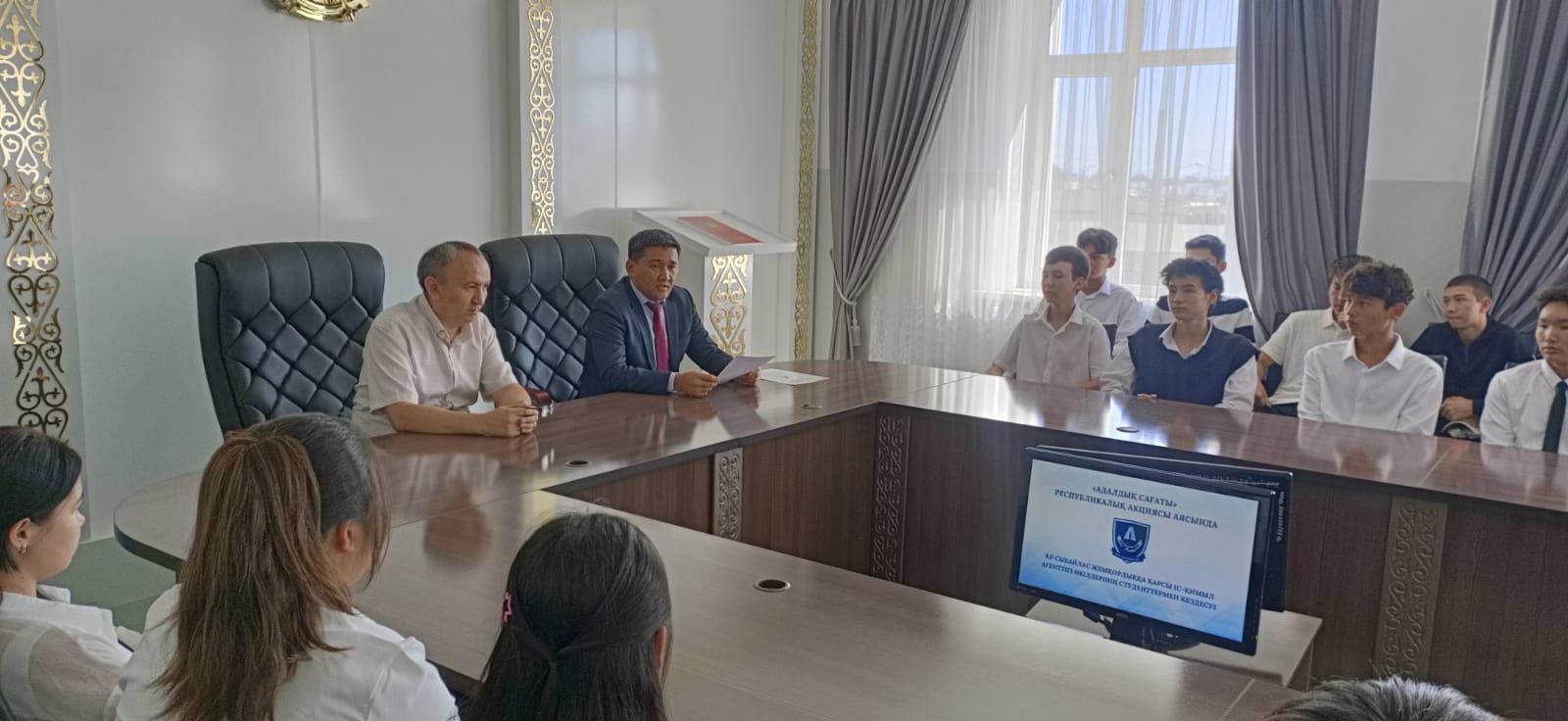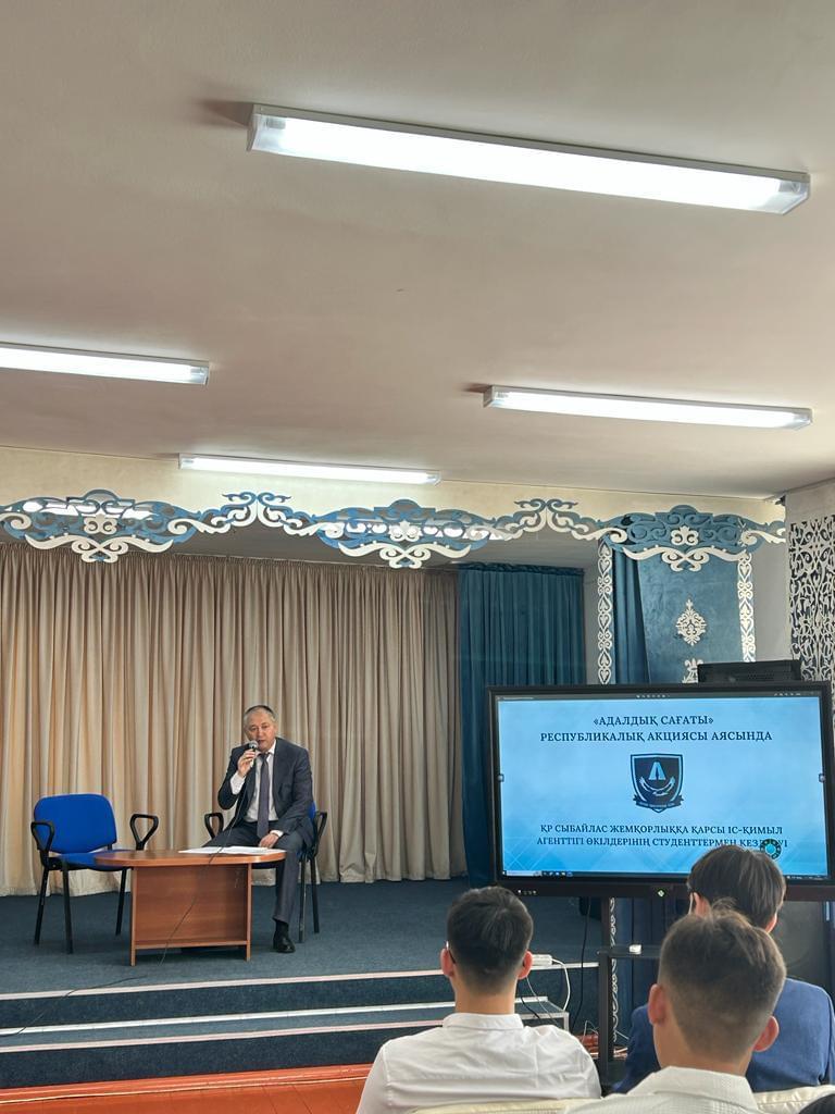 1 қыркүйек – білім күніне орай ҚР Сыбайлас жемқорлыққа қарсы іс-қимыл агенттігінің Жамбыл облысы бойынша департаментінің басшылық құрамы жоғары оқу орындары мен техникалық және кәсіптік білім беру мекемелерінің студенттерімен адалдық сағаты аясында лекция өткізді.
