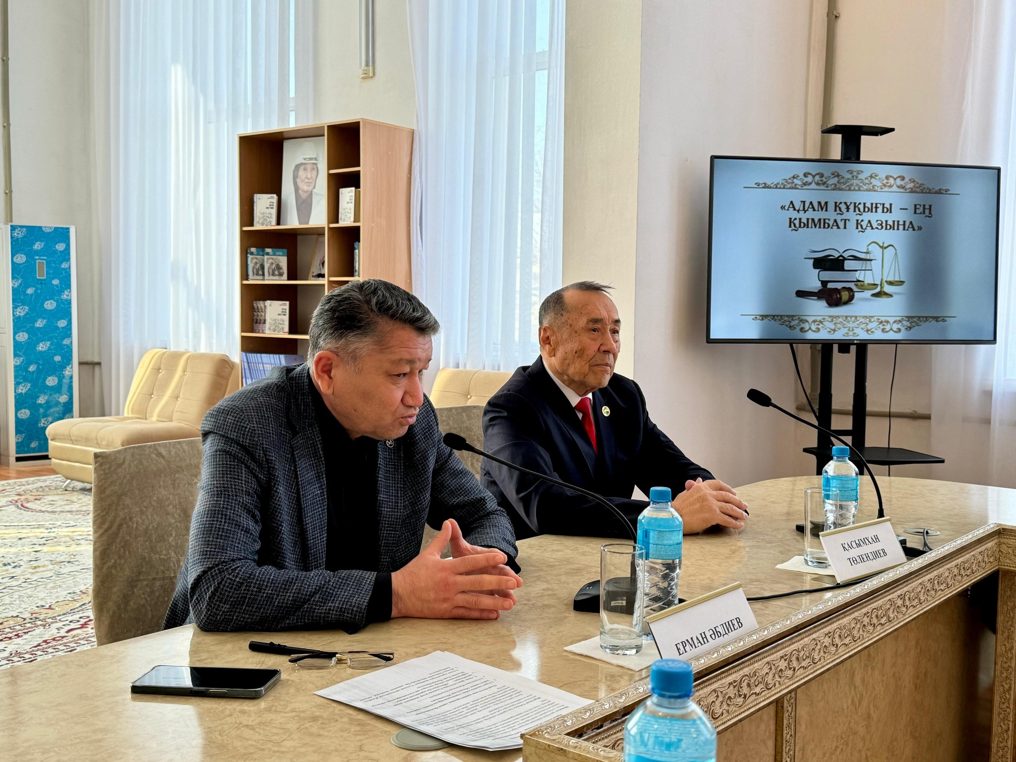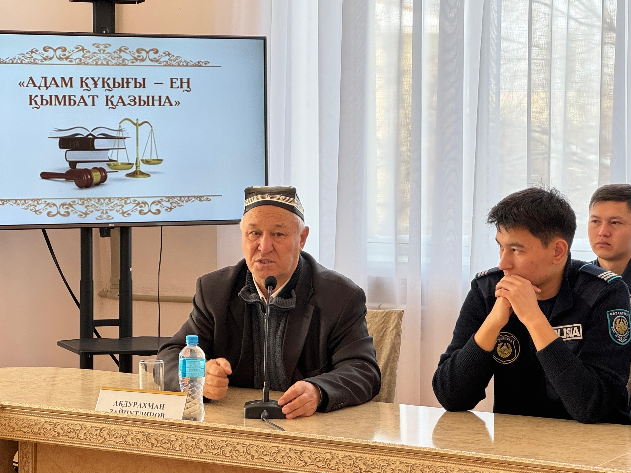 Жамбыл облыстық Ш. Уәлиханов атындағы әмбебап ғылыми кітапханасында «Адам құқығы – ең қымбат қазына» тақырыбында құқық алаңы ұйымдастырылды.Кездесуге Тараз қаласы өзбек этномәдени бірлестігінің төрағасы Зайнутдинов Абдурахман Юлдашевич, «Жаңару» сыбайлас жемқорлыққа қарсы жалпыұлттық қозғалыс» республикалық қоғамдық бірлестігінің Жамбыл облыстық филиалының директоры Қасымхан Төлендиев, Ш.Мұртаза атындағы Халықаралық Тараз Инновациялық университетінің Заң ғылымдарының магистрі, «Мемлекеттік-құқықтық пәндер» кафедрасының аға оқытушысы Әлия Мусаева, Адам құқықтары жөніндегі Ұлттық орталықтың Жамбыл облысы бойынша өкілдігінің бас маманы Айдана Бекберді және «Жамбыл облысы мамандандырылған күзет қызметі» мемлекеттік мекемесінің қызметкерлері қатысты. Құқықтану сағатына арнайы келген қонақтарымыз Отанымыздың, ел аумағының бүтіндігін сақтауды, азаматтардың құқықтары мен бостандықтарының қорғалуын қамтамасыз ету туралы айтып өтті.