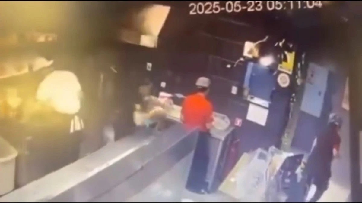 Бейнежазбада мейрамхана қызметкерінің қайнап тұрған майы бар ыдысты көтеріп келе жатып, сүрінгені көрінеді. Сол сәтте ыдыстағы май басқа қызметкердің арқасына төгілген.
