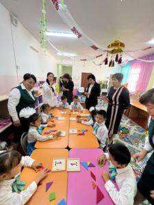 Екінші күні Тараз қаласындағы «Айсәуле» және «Нұр Әлім» жекеменшік бөбекжайларында болған делегация мүшелеріне балаларға