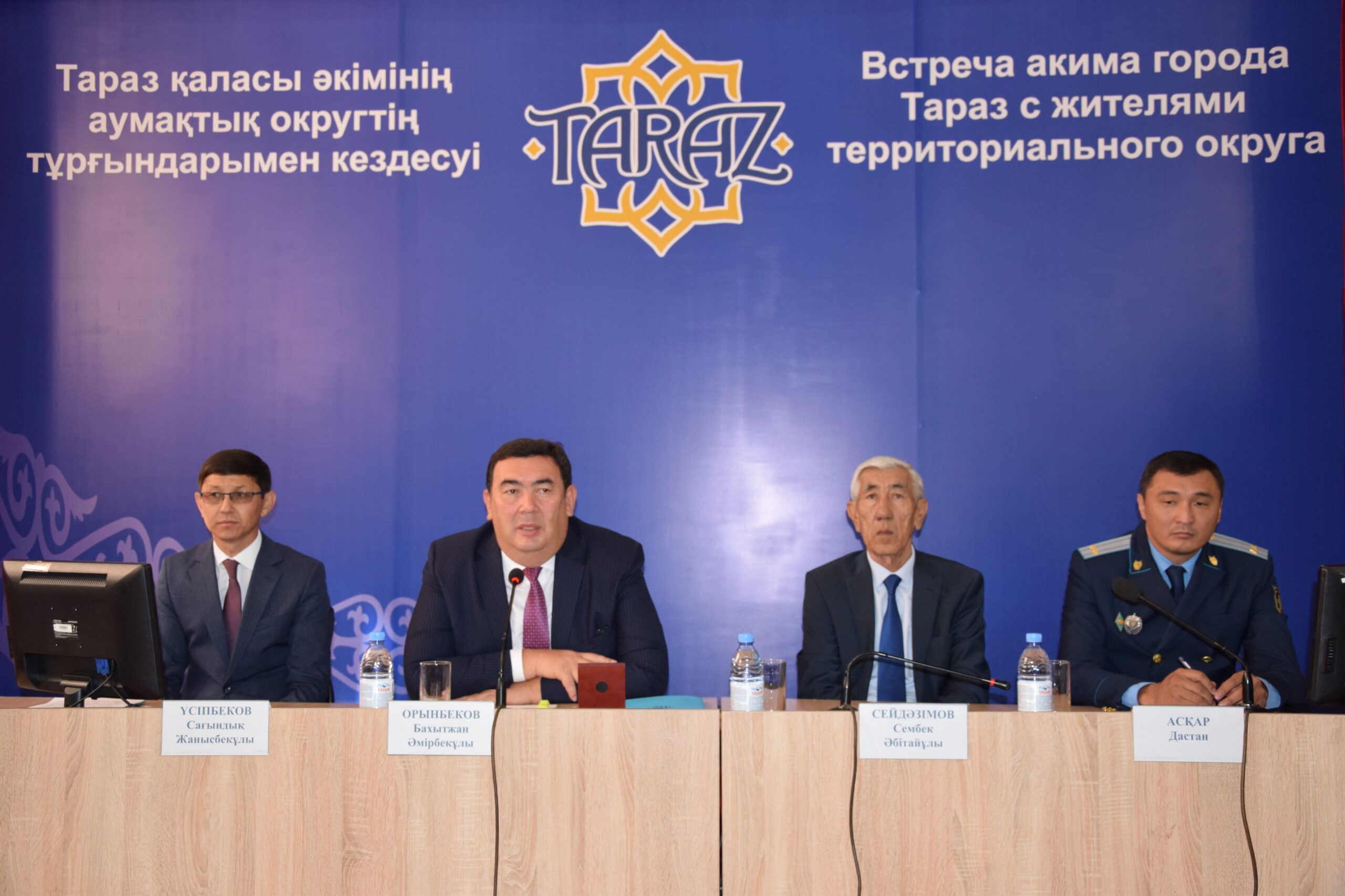 После вступления в должность аким города Тараз Б. Орынбеков встретился с представителями интеллегенций, СМИ, НПО и молодежью города. На встречах были озвучены актуальные вопросы и предложения в различных сферах. Затем глава города провел первый объезд по 15-му микрорайону. Так же градоначальник посетил массивы Чолдала, Кумшагал, Кайнар,Барысхан, Бурыл,Шанырак, где провел встречи с жителями. На каждой территории, были подняты насущные, требующие решения проблемные вопросы, беспокоившие жителей многие годы.
