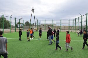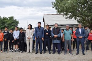Ізгі тілектерден кейін аудан әкімінің орынбасары Махпал Досымбекова мен ауыл қариясы спорт алаңшасының кермесін қиып, жасөспірімдердің кіші футболдан ойындарын тамашалады.