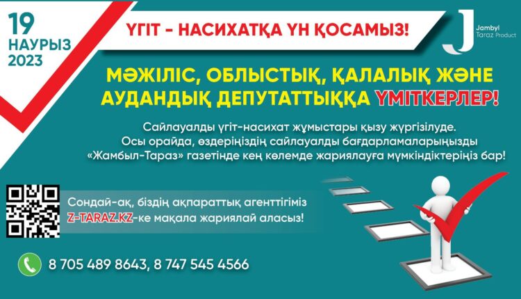 Сайлауалды үгіт-насихат жұмыстары қызу жүргізілуде. Осы орайда, өздеріңіздің сайлауалды бағдарламаларыңызды «Жамбыл-Тараз» газетінде кең көлемде жариялауға мүмкіндіктеріңіз бар!