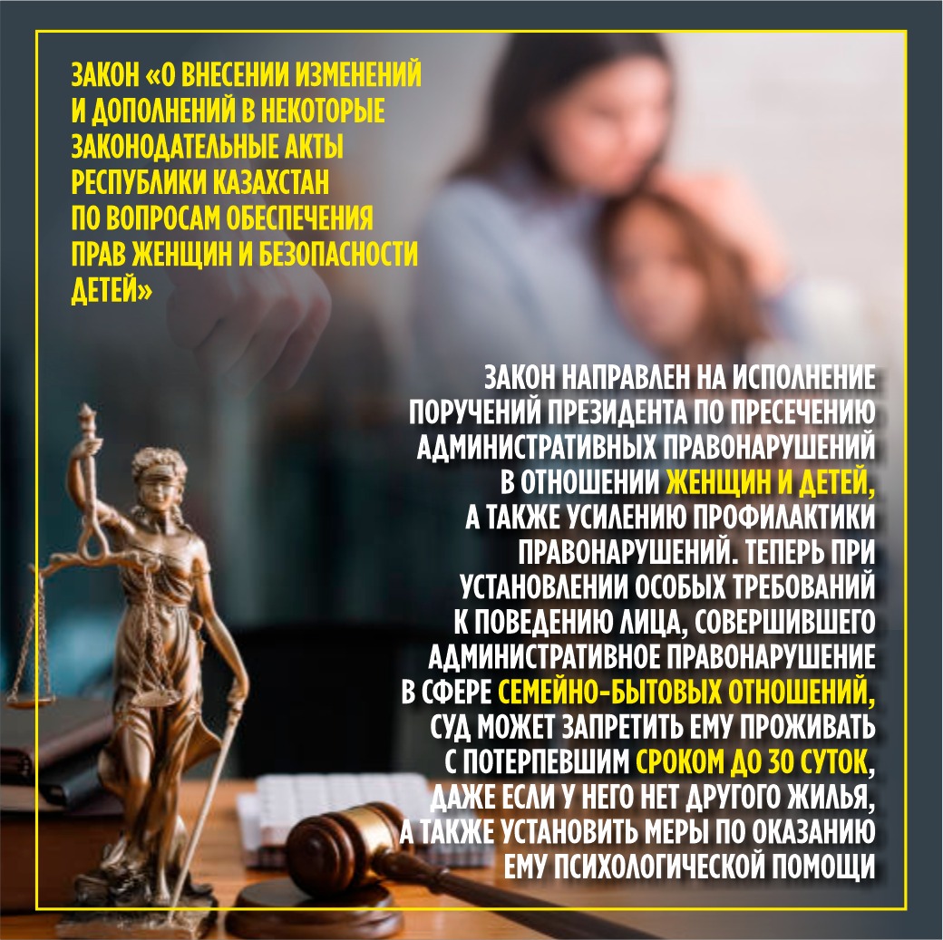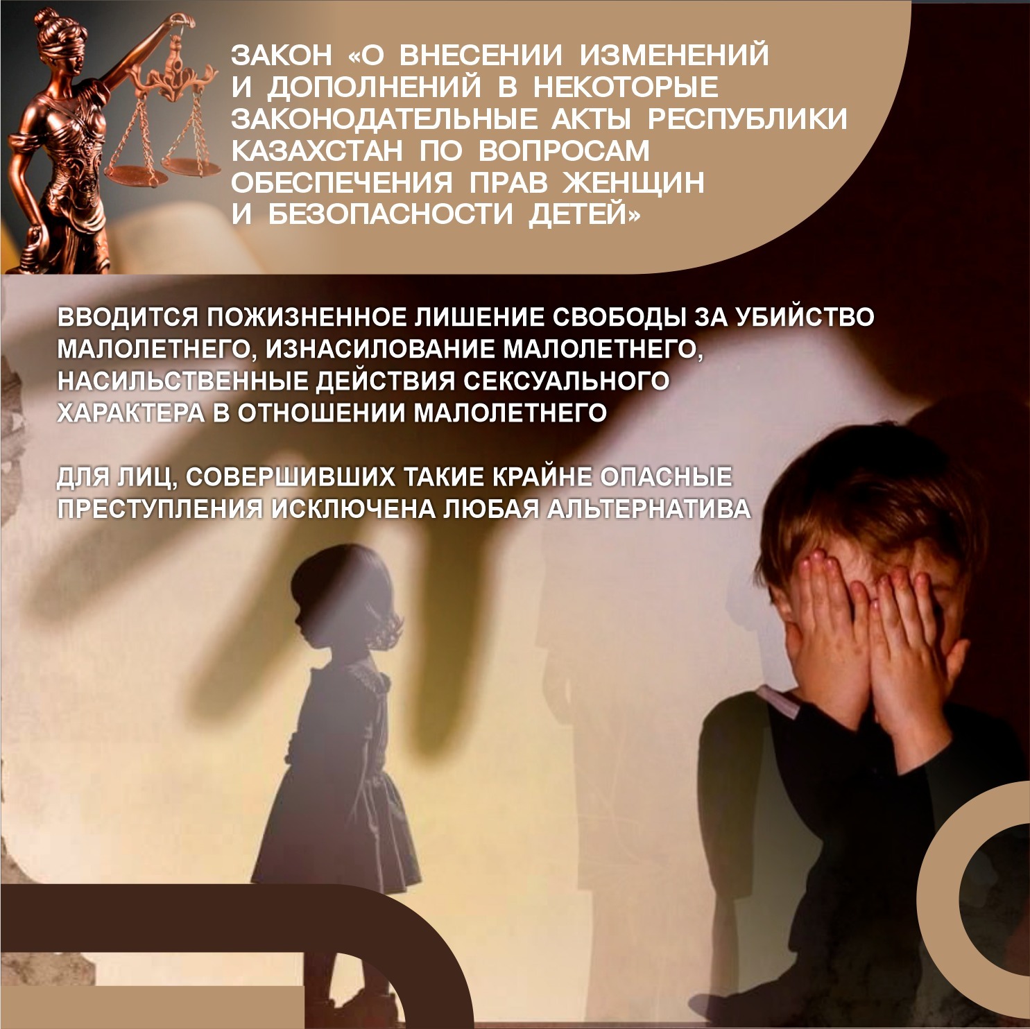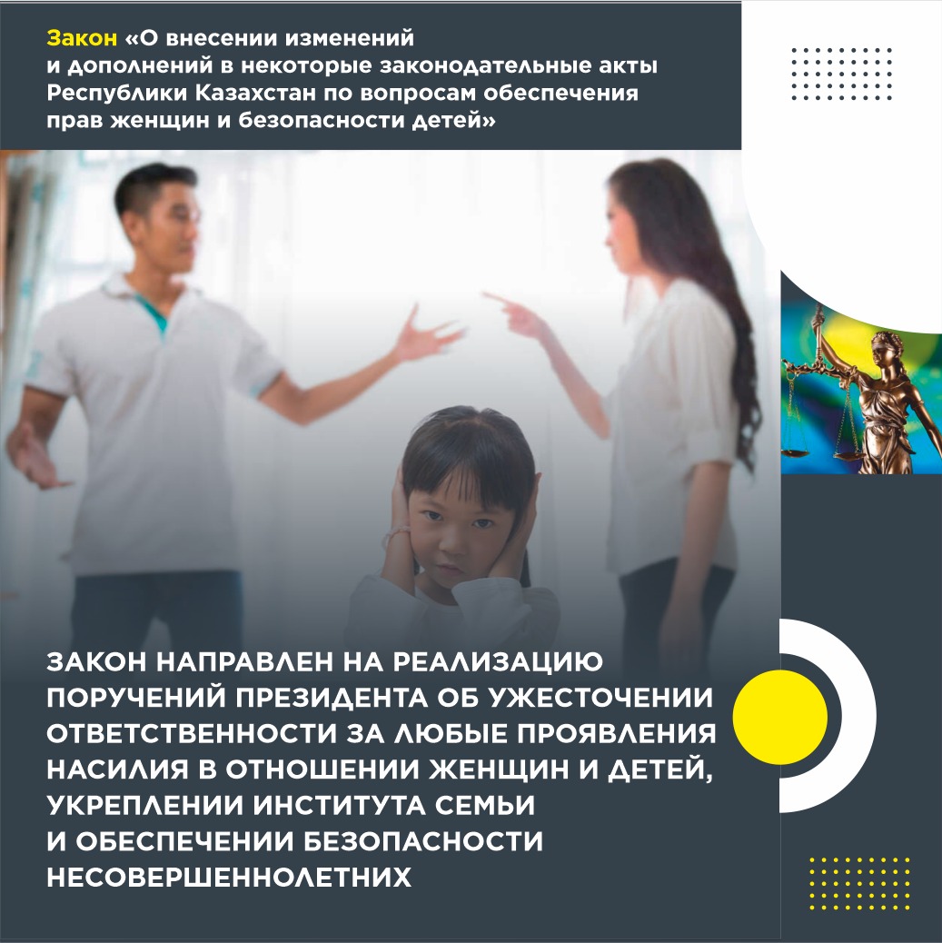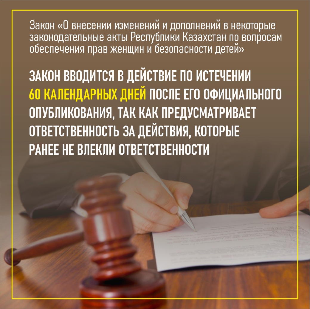 Президентом Касым-Жомартом Токаевым подписаны законы Республики Казахстан «О внесении изменений и дополнений в некоторые законодательные акты Республики Казахстан по вопросам обеспечения прав женщин и безопасности детей» и «О внесении изменений и дополнений в Кодекс Республики Казахстан об административных правонарушениях по вопросам обеспечения прав женщин и безопасности детей».