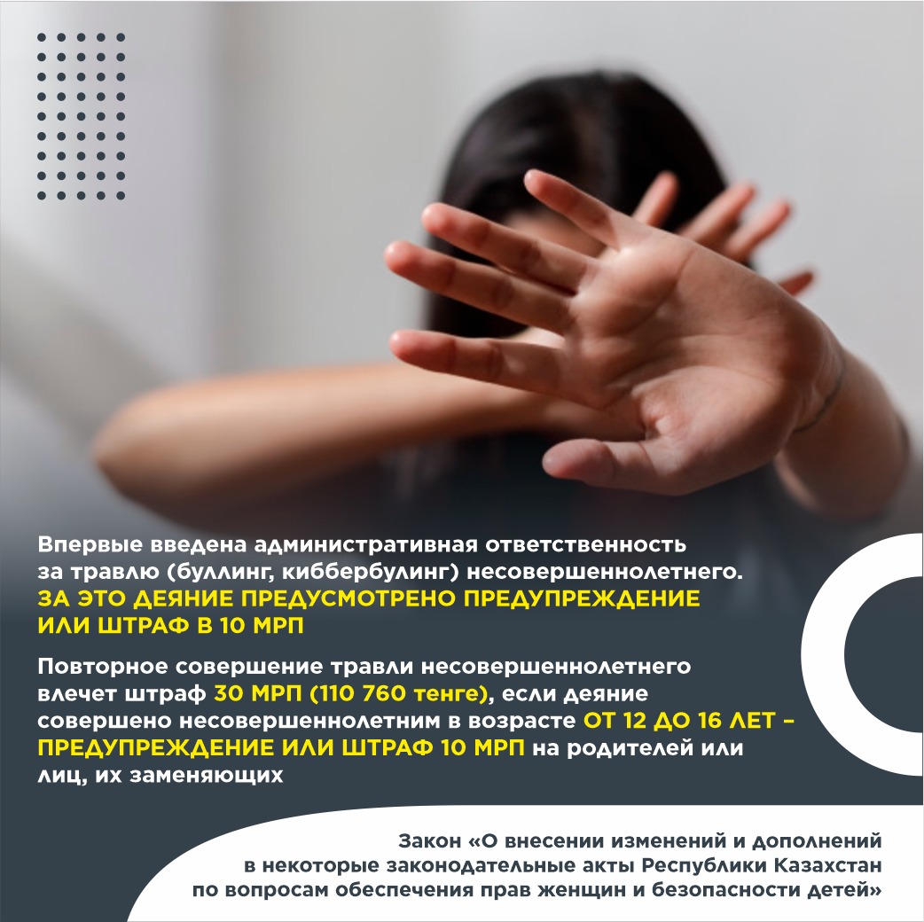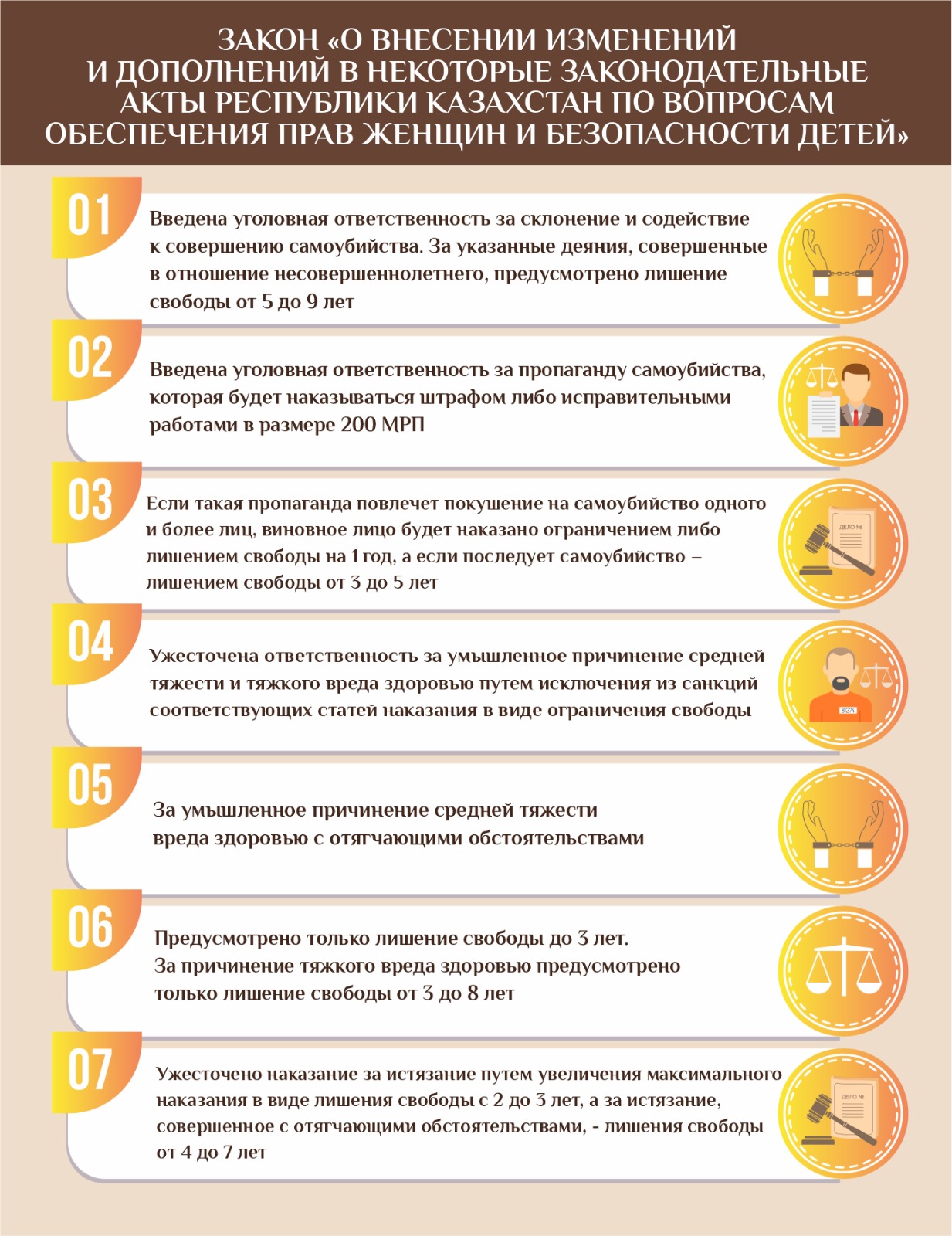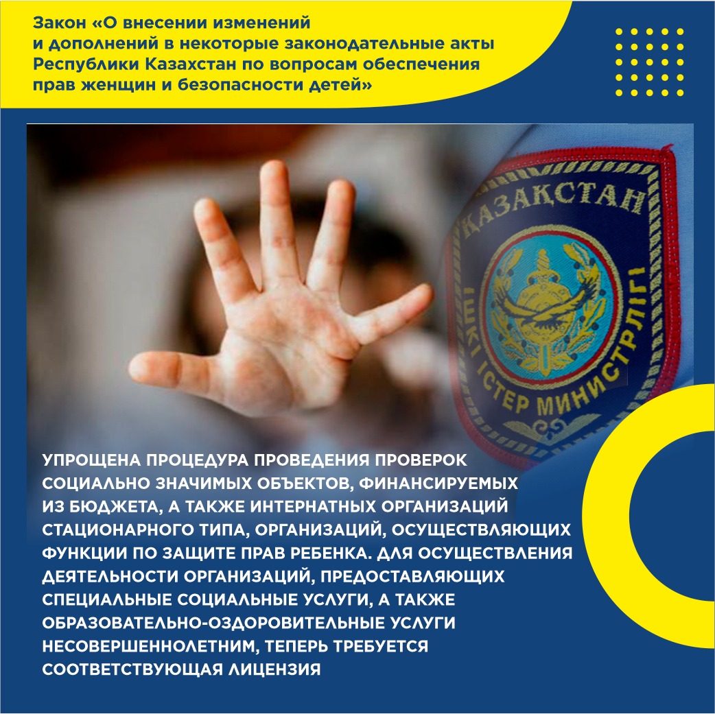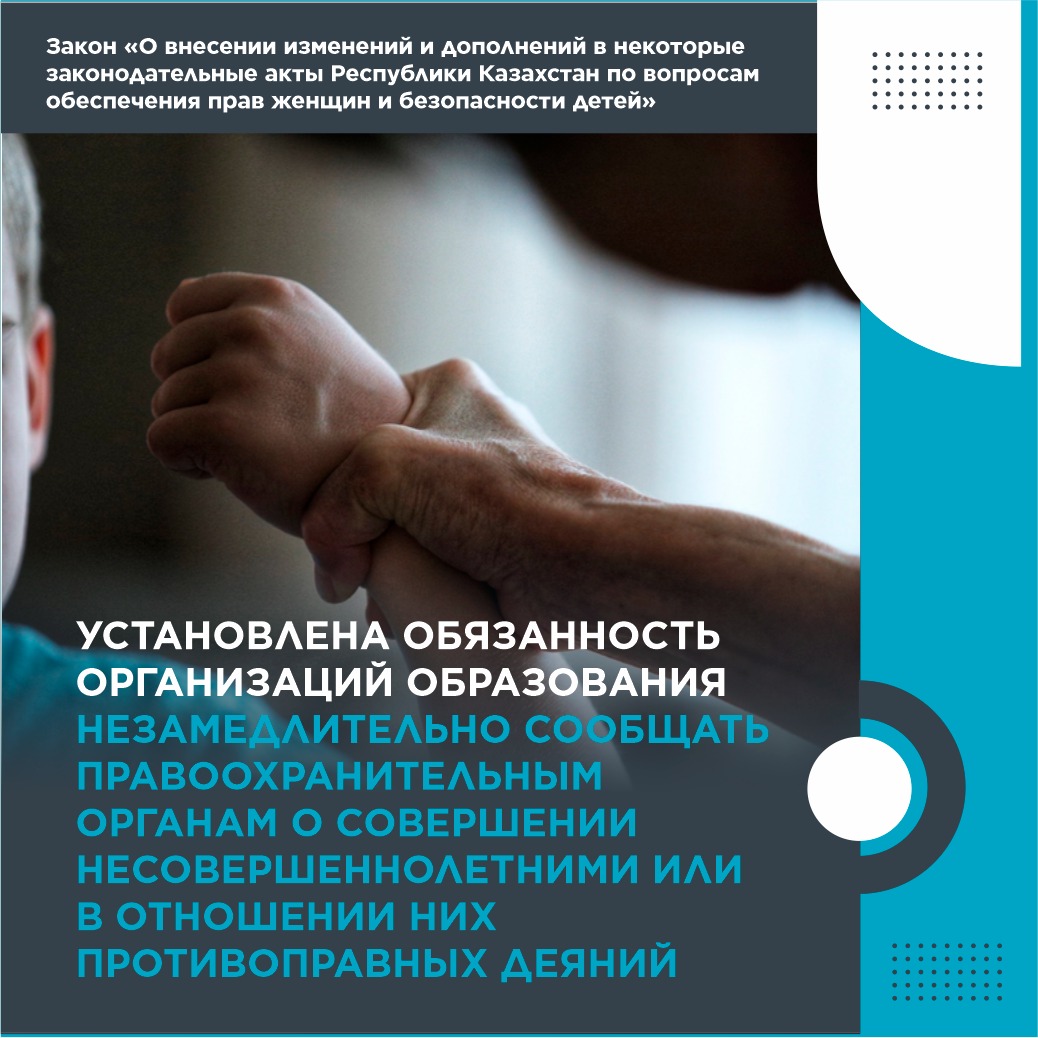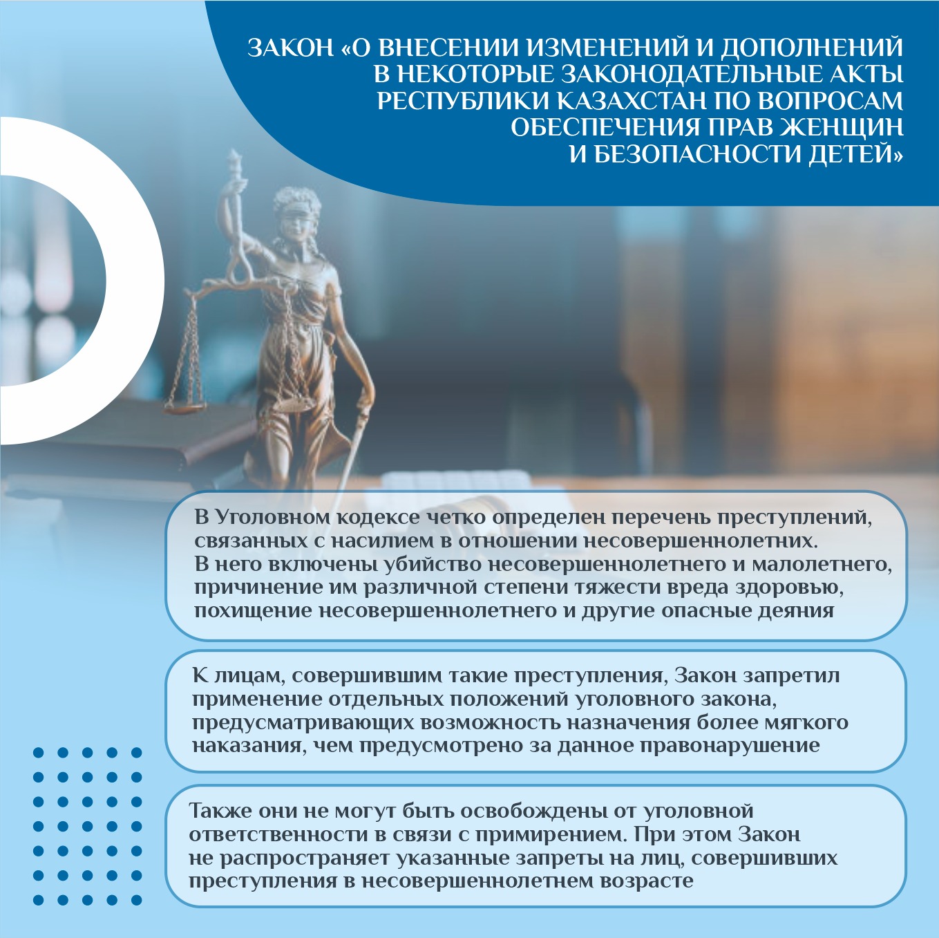 Президентом Касым-Жомартом Токаевым подписаны законы Республики Казахстан «О внесении изменений и дополнений в некоторые законодательные акты Республики Казахстан по вопросам обеспечения прав женщин и безопасности детей» и «О внесении изменений и дополнений в Кодекс Республики Казахстан об административных правонарушениях по вопросам обеспечения прав женщин и безопасности детей».