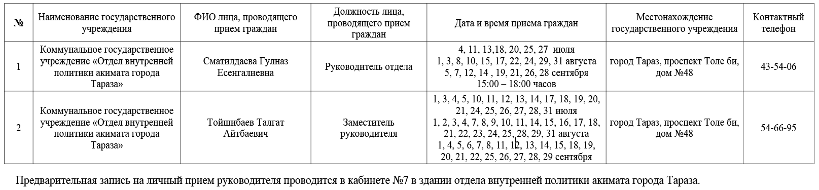 График приема физических лиц и представителей юридических лиц руководителем и заместителем руководителя отдела внутренней политики акимата города Тараза на ІІІ квартал 2023 года Официально On Июл 5, 2023 0 1 337 Бөлісу 0 1 337 Бөлісу FacebookTwitterGoogle+ReddItWhatsAppPinterestEmail