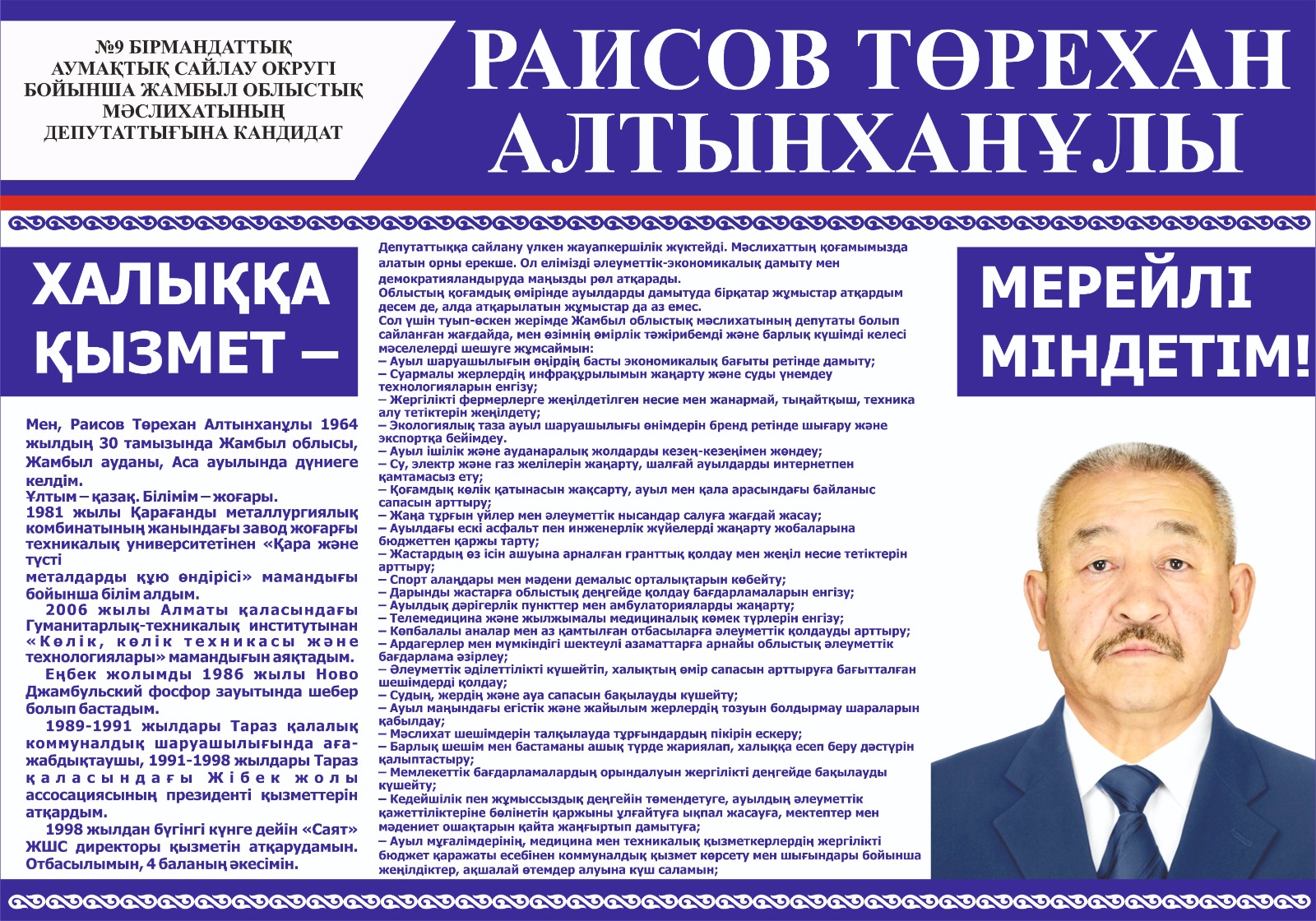 Тапсырыс беруші: №9 бірмандаттық аумақтық сайлау округі бойынша Жамбыл облыстық мәслихатының депутаттығына кандидат Раисов Т.А.
