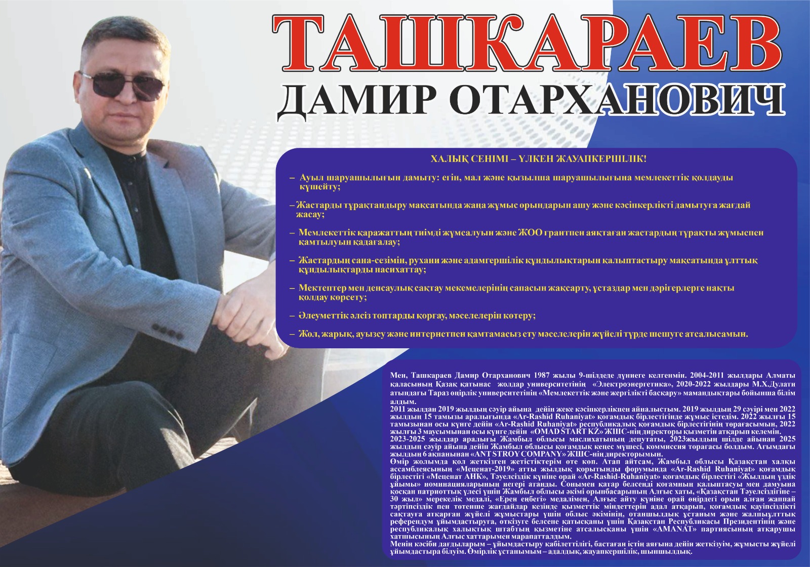 Тапсырыс беруші: №9 бірмандаттық аумақтық сайлау округі бойынша Жамбыл облыстық мәслихатының депутаттығына кандидат Ташкараев Д.О.