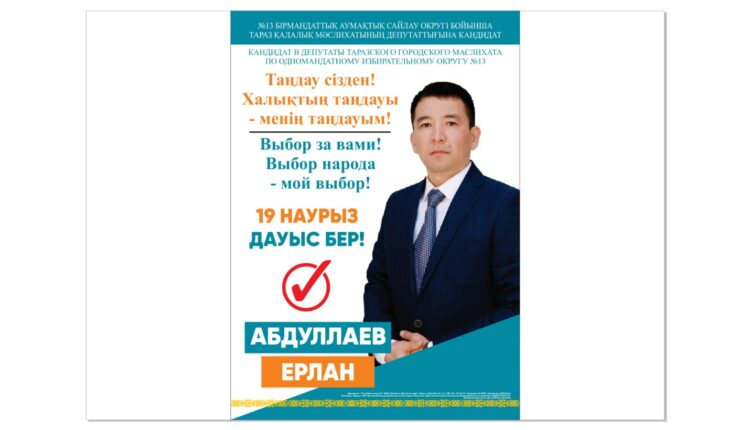 Тапсырыс беруші: №16 бір мандаттық аумақтық сайлау округі бойынша Тараз қалалық мәслихатының депутаттығына кандидат АБДУЛАЕВ Е.Қ.