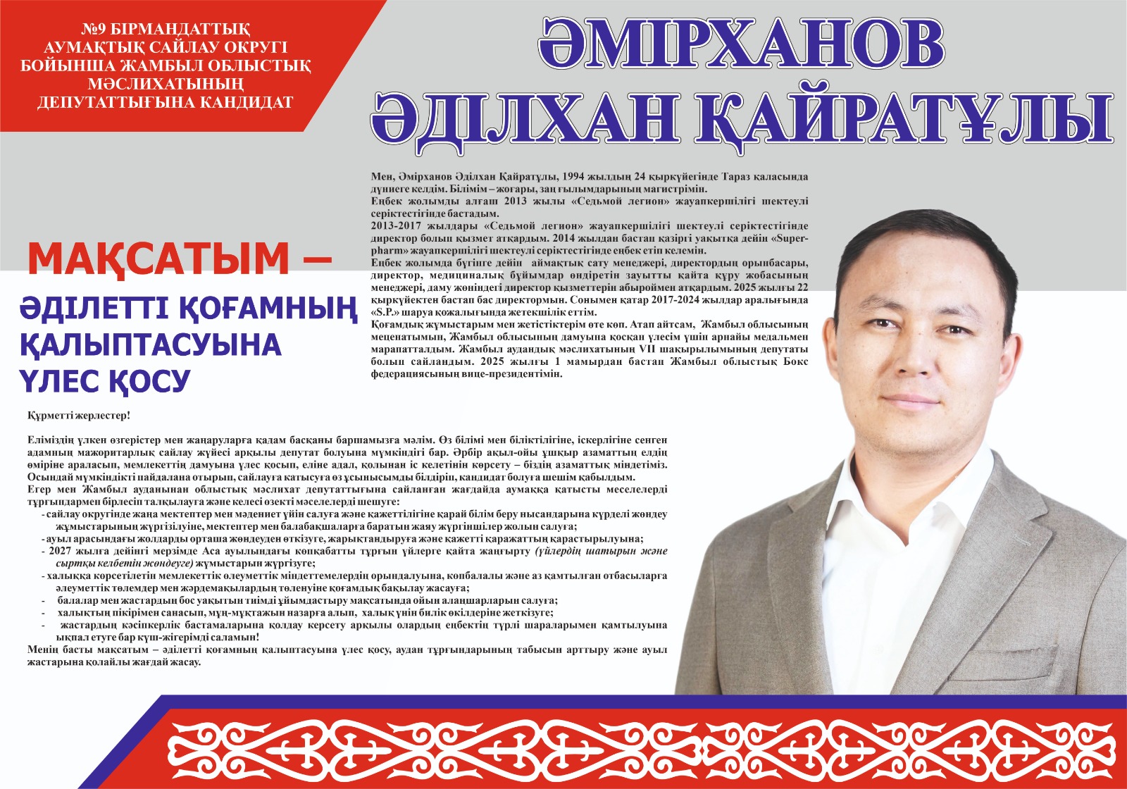 Тапсырыс беруші: №9 бірмандаттық аумақтық сайлау округі бойынша Жамбыл облыстық мәслихатының депутаттығына кандидат Әмірханов Ә.Қ.