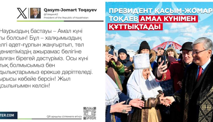 «Әз-Наурыздың бастауы – Амал күні құтты болсын! Бұл – халқымыздың ежелгі әдет-ғұрпын жаңғыртып, төл мәдениетіміздің ажырамас бөлігіне айналған бірегей дәстүріміз. Осы күні ұлттық болмысымыз бен құндылықтарымыз ерекше дәріптеледі. Ел ырысы көбейе берсін! Жыл жақсылығымен келсін!» – деп жазды Президент өзінің Х парақшасында.