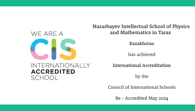 Назарбаев Интеллектуальная школа города Тараза, физико-математическом направлении, получила сертификат от Совета международных школ CIS, подтверждающий успешное прохождение реаккредитации. Школа впервые была аккредитована CIS в 2018 году.