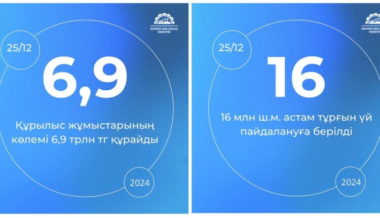 Қаңтар мен қараша аралығында 16,3 млн ш.м. тұрғын үй пайдалануға берілді. Бұл өткен жылдың сәйкес кезеңінен 8,3%-ға жоғары. Сондай-ақ, бүгінгі таңда 146 мыңға жуық тұрғын үй, оның ішінде 35 187 жеке үй тапсырылды.