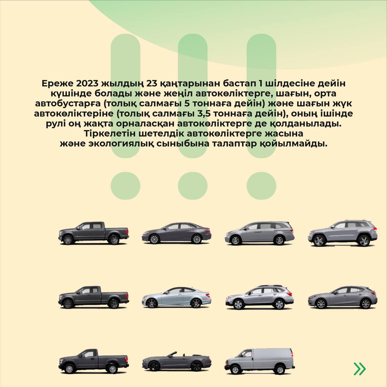 Шетелдік автокөліктерді заңдастыру жұмыстары бір реттік акция ретінде ұйымдастырылып жатыр. Айта кетейік, бұл ережелер 2023 жылдың 1 шілдесіне дейін күшінде болады және жеңіл автокөліктерге, шағын, орта автобустарға (толық салмағы 5 тоннаға дейін) және шағын жүк автокөліктеріне (толық салмағы 3,5 тоннаға дейін), оның ішінде басқару органдарының оң жақты орналасуына қолданылады. Тіркелетін шетелдік автокөліктерге жасына және экологиялық сыныбына талаптар қойылмайды.