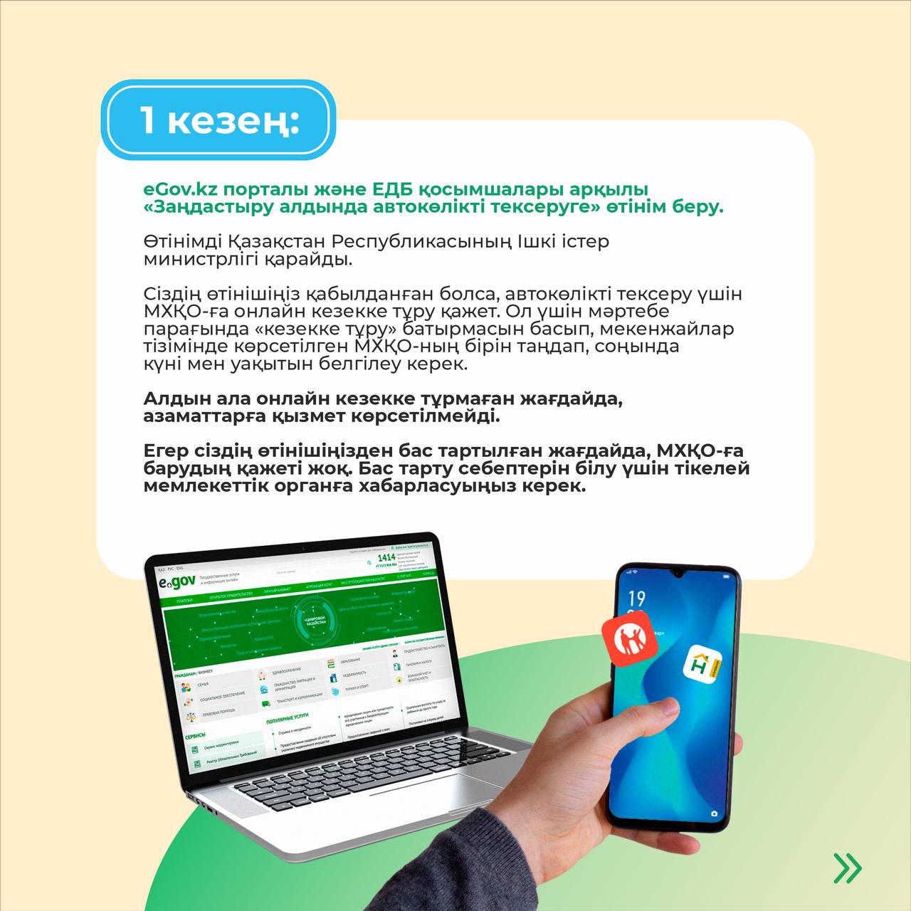 1. Ең алдымен, сіз eGov.kz порталы арқылы деректерді тексеруге өтініш беруіңіз керек. Дербес компьютерге қол жеткізе алмайтын автокөлік иелері, еліміздің кез келген ХҚКО-ларында өзіне-өзі қызмет көрсету секторы арқылы өтініш бере алады. ЕДБ қосымшаларында (Kaspi, HomeBank) бұл қызметті алу бойынша жұмыстар жүргізілуде. Автокөліктің тіркеу деректері қатесіз толтырылуы қажет.