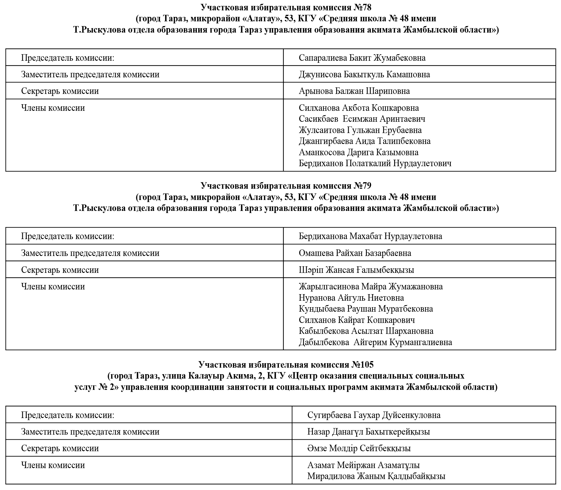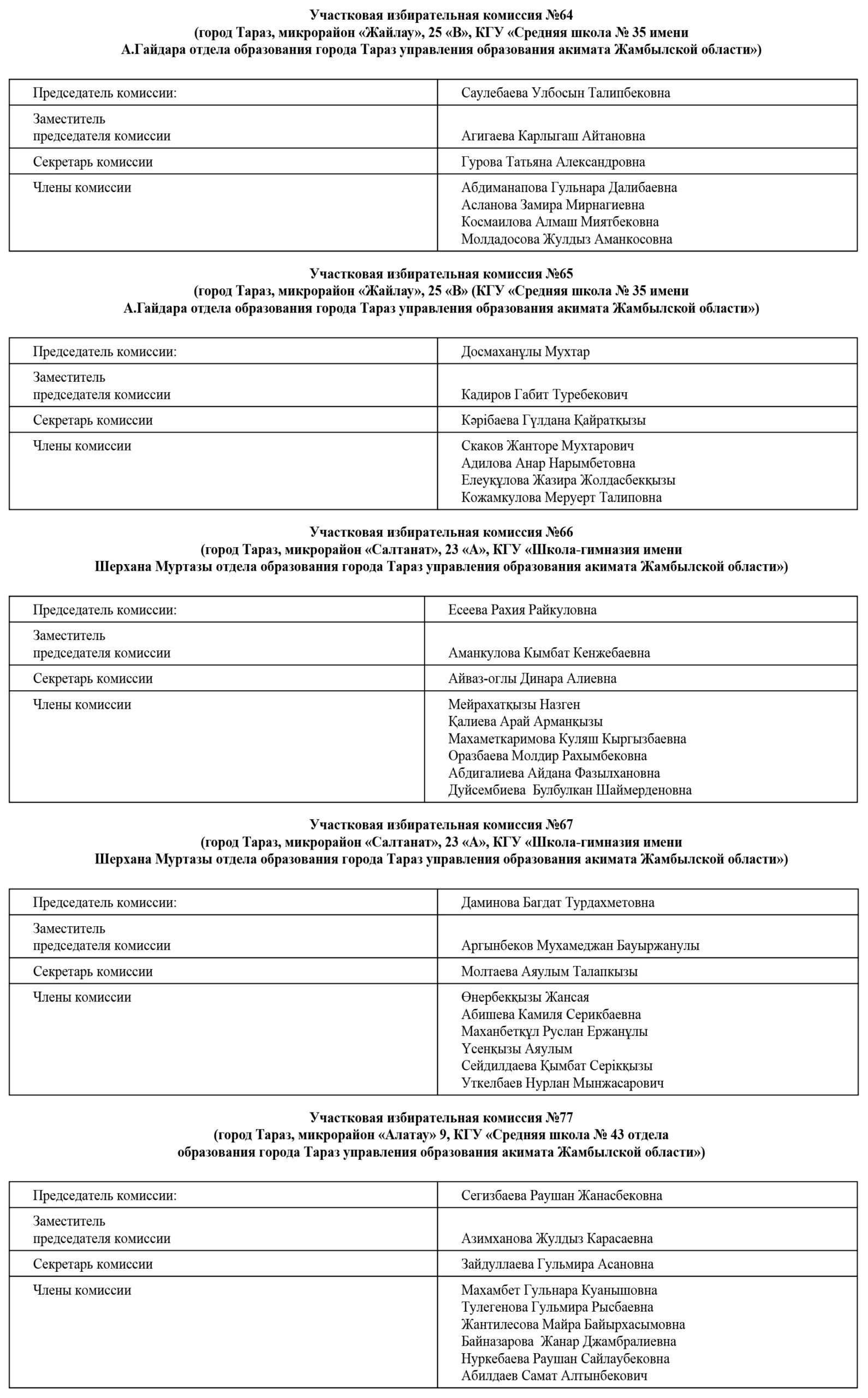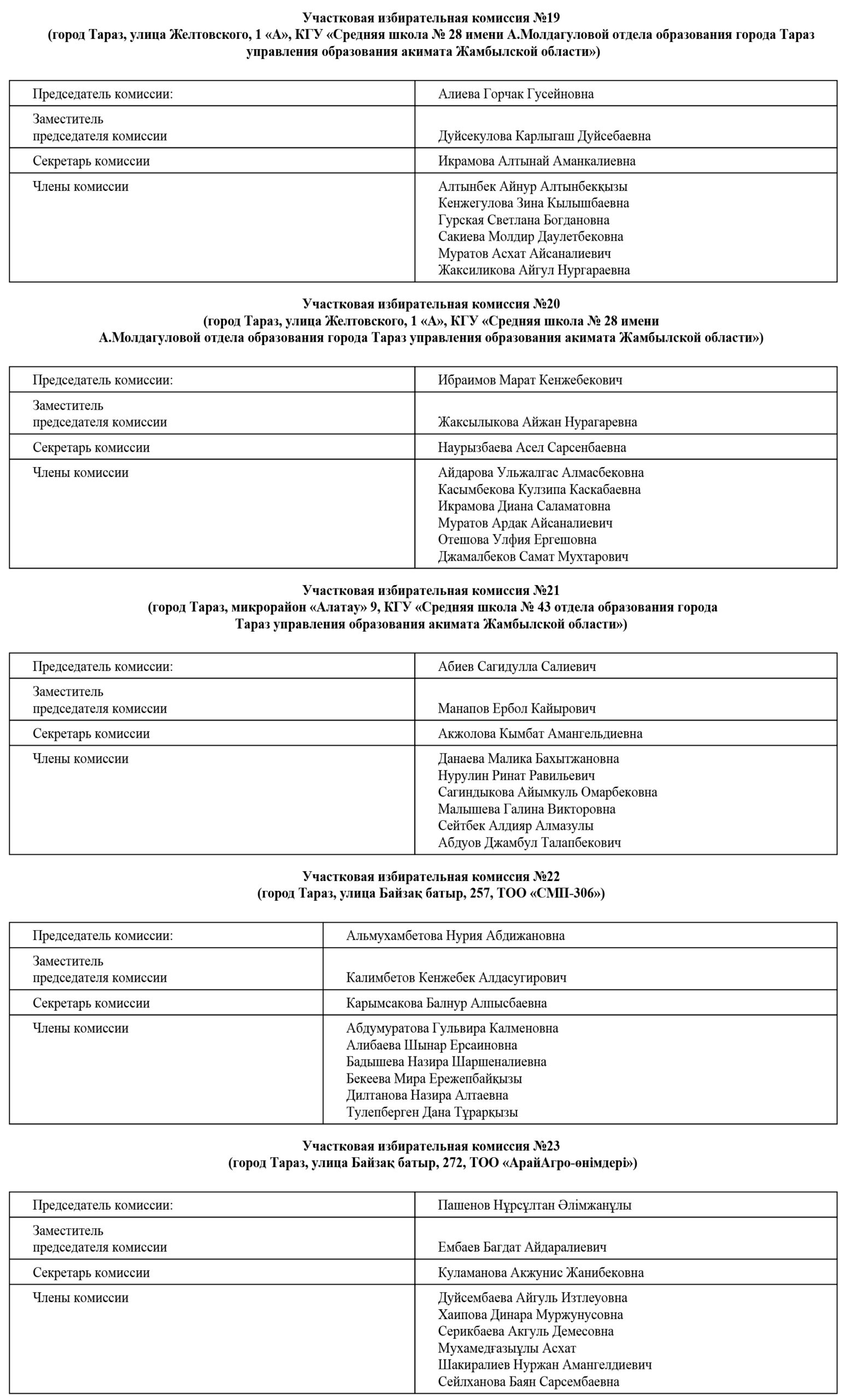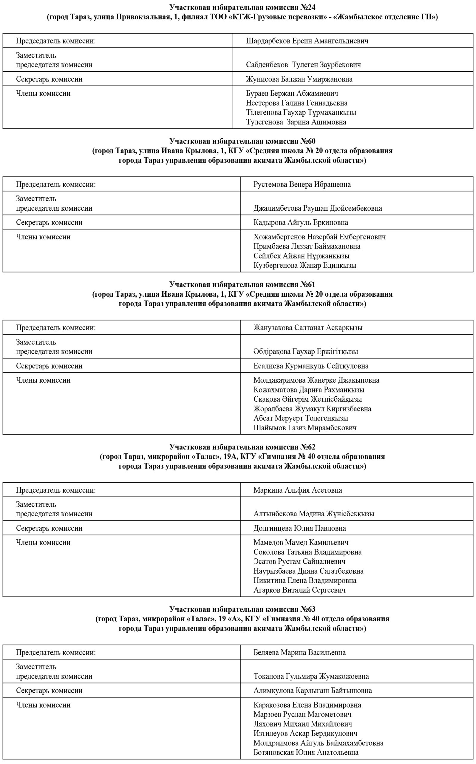 В соответствии с пунктом 2 статьи 17 Конституционного Закона Республики Казахстан «О выборах в Республике Казахстан» и пунктом 4 календарного плана основных мероприятий по подготовке и проведению выборов депутата Жамбылского областного маслихата вместо выбывшего, назначенных на 8 декабря 2024 года, сообщает о следующем составе участковых избирательных комиссий одномандатного территориального избирательного округа №4 по выборам депутата Жамбылского областного маслихата: