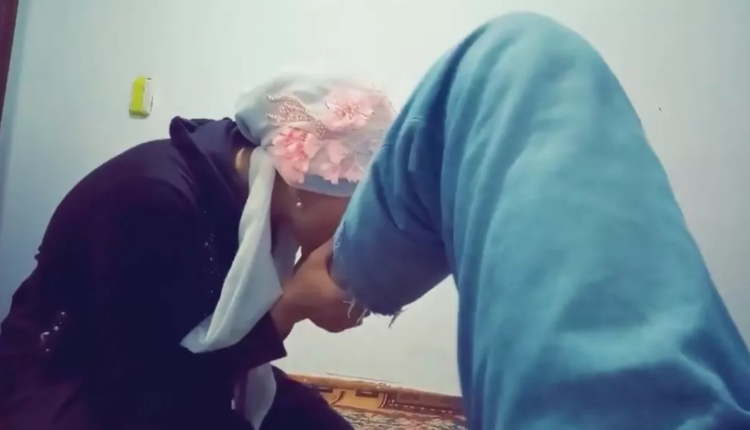 Бейнежазба әлеуметтік желілерде тарады. Онда орамал таққан келіншек басын төмен қарата ерінің аяғын бірнеше рет сүйеді.