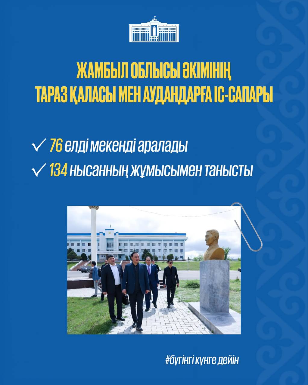 Облыс әкімі Ербол Қарашөкеев ағымдағы жылы 76 елді мекенді аралап, 134 нысанның жұмысымен танысты. Тараз қаласы мен облыс аудандарына іс-сапарлар алдағы уақытта да жалғасын табады.