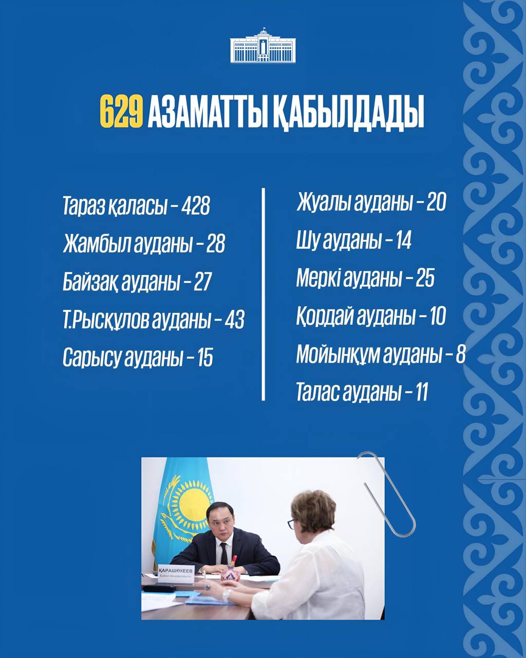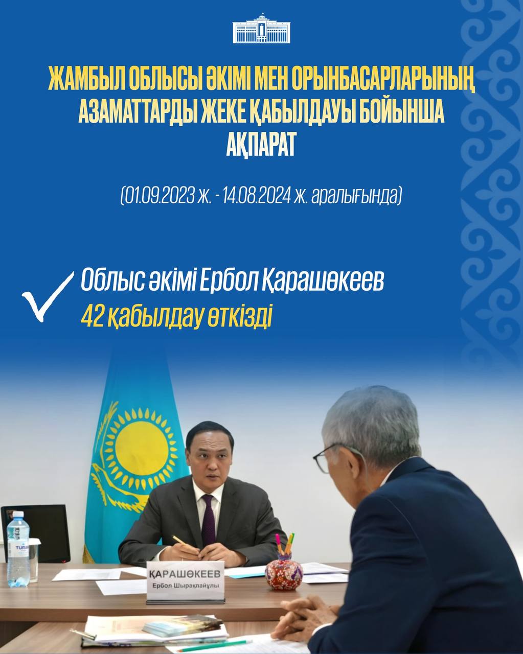 Мәселен, Жамбыл облысының әкімі Ербол Қарашөкев 2023 жылдың 1 қыркүйегі мен биылғы жылдың 14 тамызы аралығында 42 жеке қабылдау өткізіп, 629 азаматтың мәселесіне құлақ түрді. Олардың қатарында Тараз қаласы мен барлық аудан тұрғындары бар.