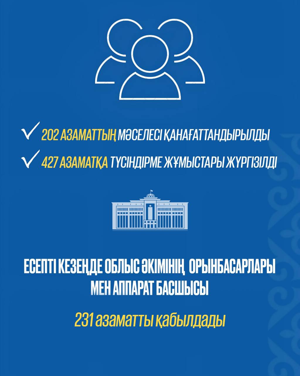 Қабылдауда болған 202 азаматтың өтініш-тілегі шешімін тауып, 427 тұрғынға түсіндірме жұмыстары жүргізілді.