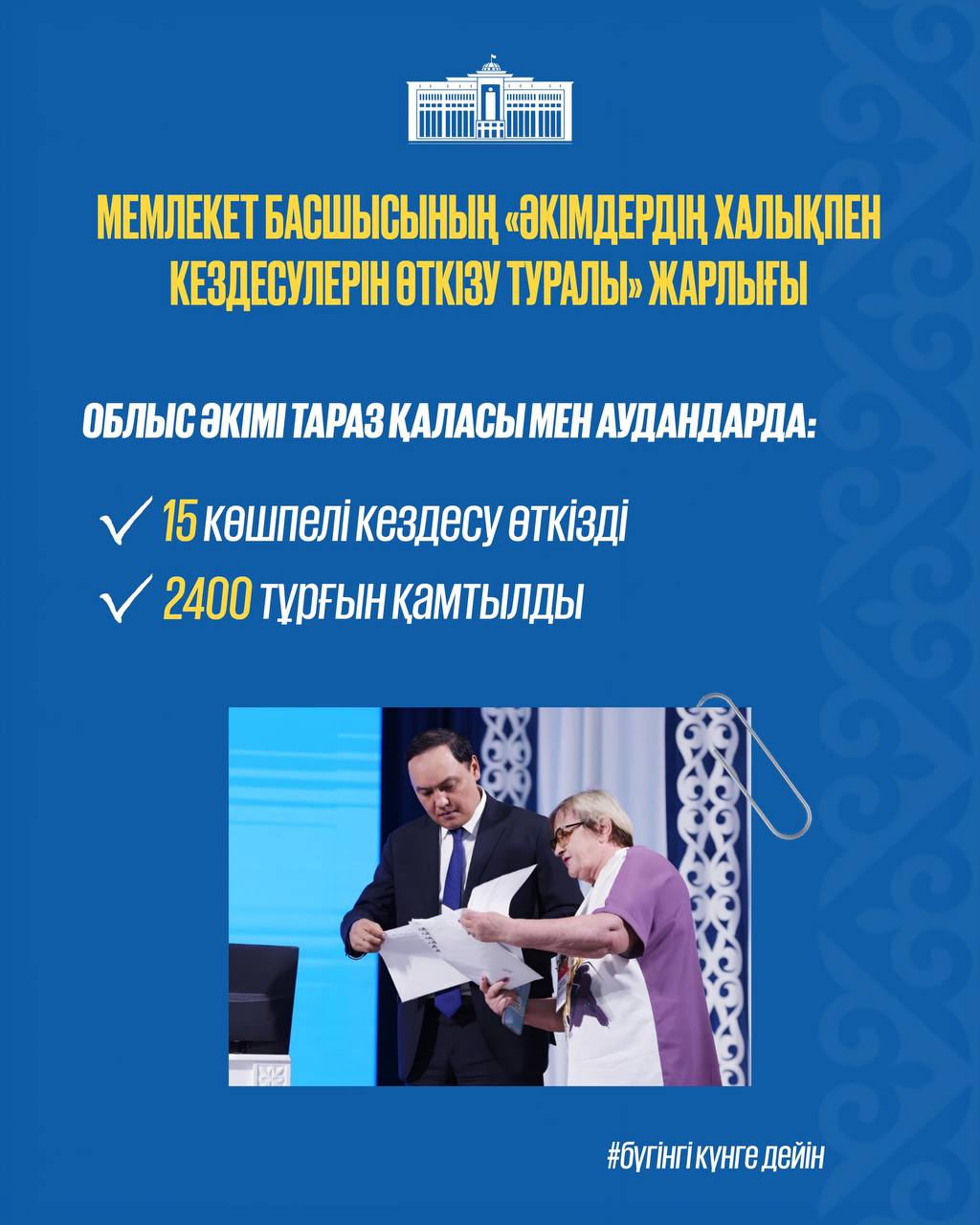 Мемлекет басшысының «Халық үніне құлақ асатын мемлекет» Тұжырымдамасы бойынша Жамбыл облысындағы барлық деңгейдегі әкімдер, басқарма басшылары мен олардың орынбасарлары азаматтарды тұрақты түрде қабылдап, мәселелерін назарға алуда.