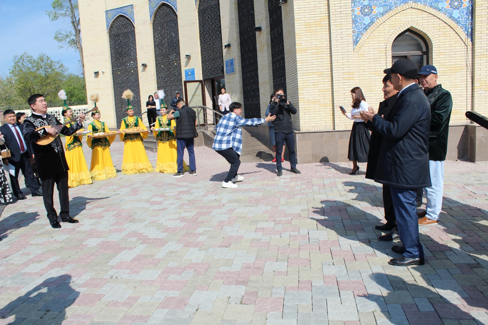 Түркістандық қонақтарды Көрме залының фойесінде Тараз қаласындағы Абай атындағы гуманитарлық колледжінің домбырашылар оркестрі қарсы алды.