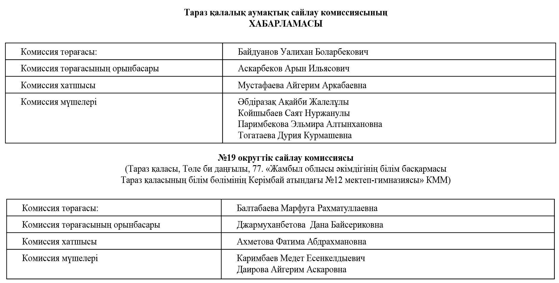 «Қазақстан Республикасындағы сайлау туралы» Қазақстан Республикасы Конституциялық заңының 13-бабының 4-тармағына, 15-1 бабының 3-тармағына және 2024 жылғы 8 желтоқсанға тағайындалған Тараз қалалық мәслихатының шығып қалған депутатының орнына сайлауды әзірлеу мен өткізу жөніндегі негізгі іс-шаралардың күнтізбелік жоспарының 2-тармағына сәйкес, Тараз қалалық аумақтық сайлау комиссиясы аумақтық, округтік сайлау комиссияларының келесі құрамы туралы хабарлайды:
