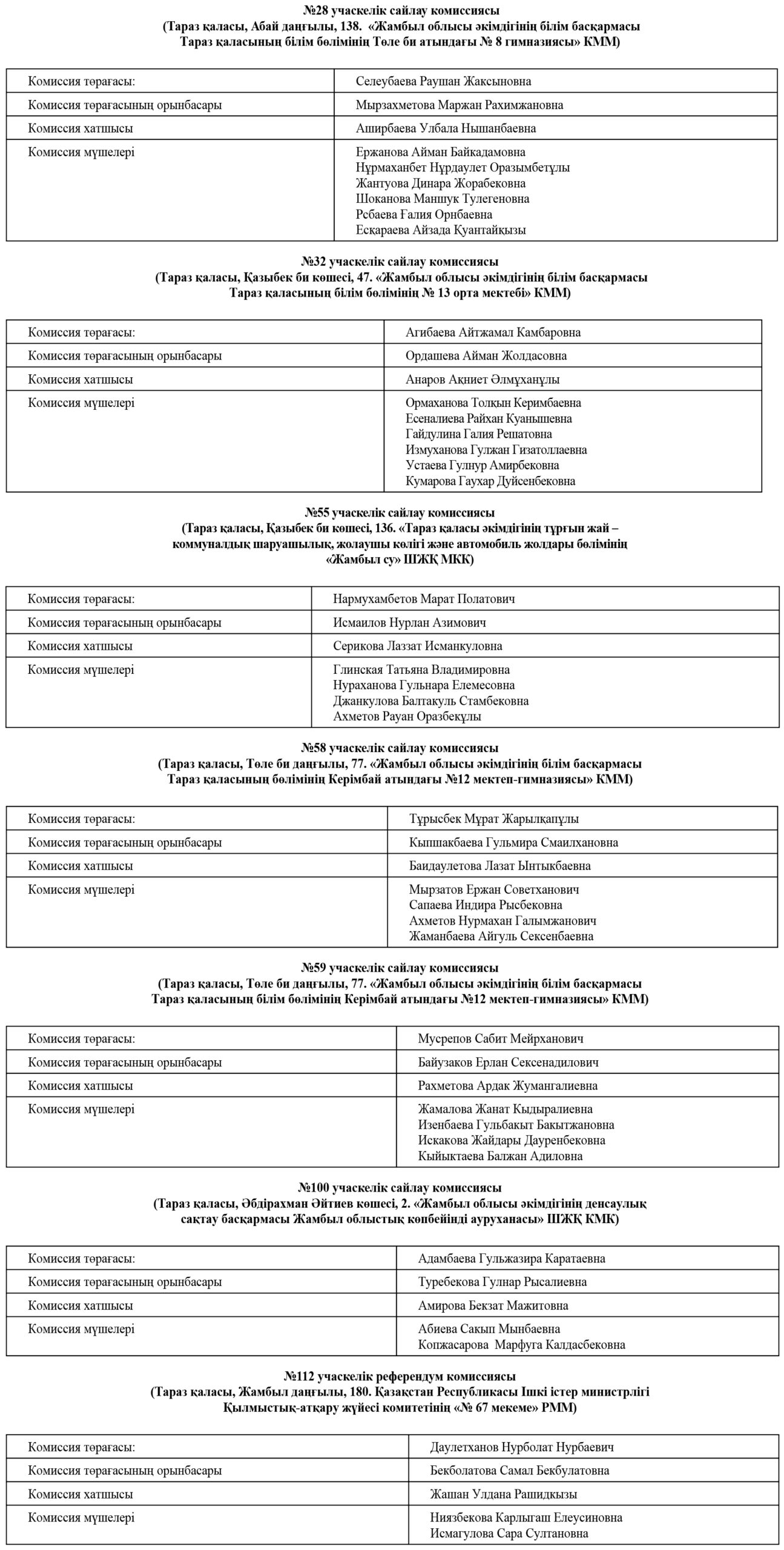 «Қазақстан Республикасындағы сайлау туралы» Қазақстан Республикасы Конституциялық заңының 17-бабының 2-тармағына және 2024 жылғы 8 желтоқсанға тағайындалған Тараз қалалық мәслихатының шығып қалған депутатының орнына сайлауды әзірлеу мен өткізу жөніндегі негізгі іс-шаралардың күнтізбелік жоспарының 4-тармағына сәйкес, Тараз қалалық аумақтық сайлау комиссиясы учаскелік сайлау комиссияларының келесі құрамы туралы хабарлайды: