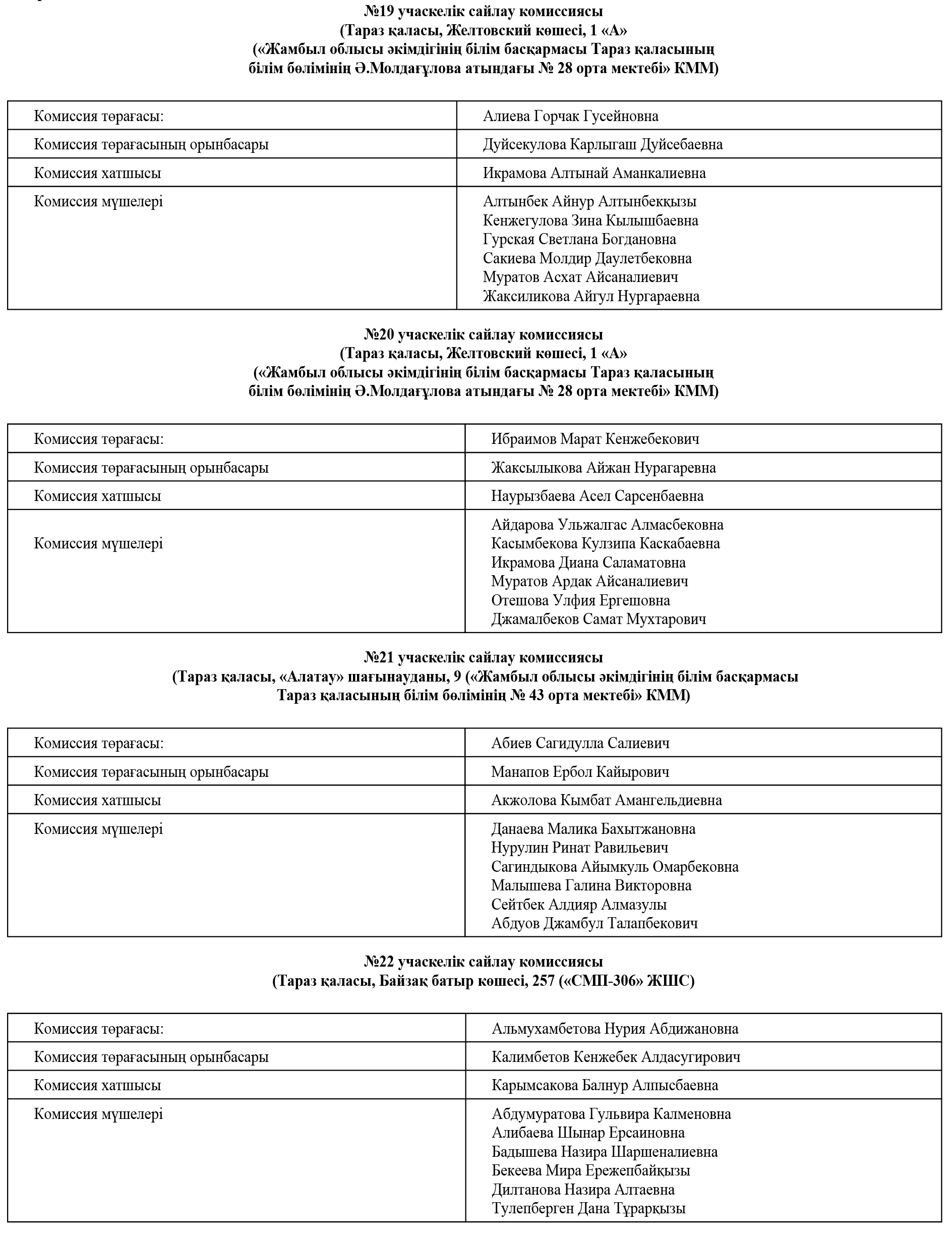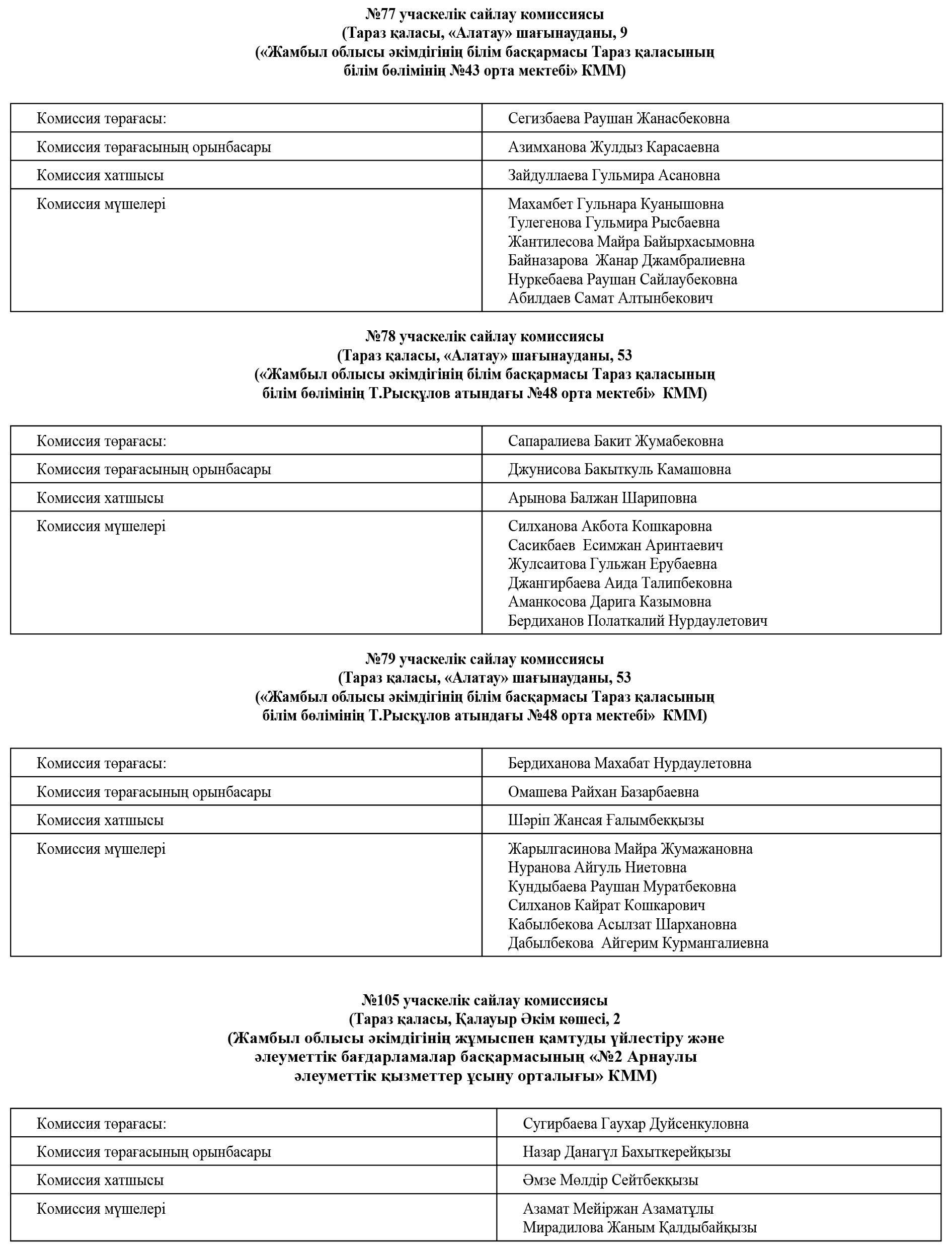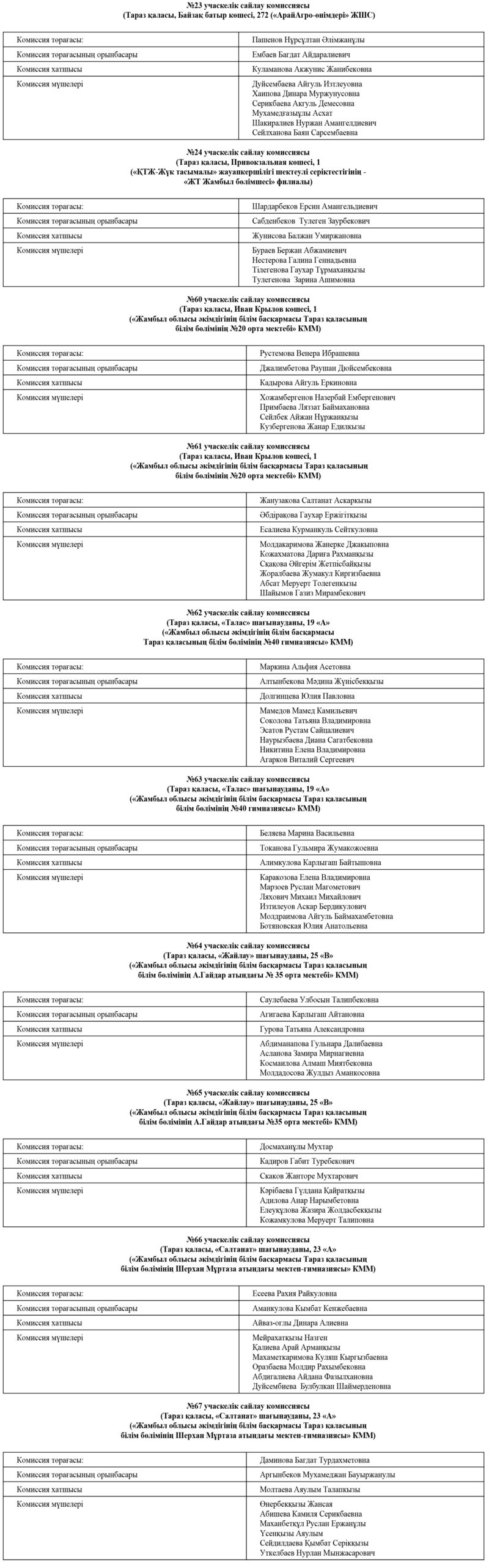 «Қазақстан Республикасындағы сайлау туралы» Қазақстан Республикасы Конституциялық заңының 17-бабының 2-тармағына және 2024 жылғы 8 желтоқсанға тағайындалған Жамбыл облыстық мәслихатының шығып қалған депутатының орнына сайлауды әзірлеу мен өткізу жөніндегі негізгі іс-шаралардың күнтізбелік жоспарының 4-тармағына сәйкес, Жамбыл облыстық мәслихатының депутатын сайлау бойынша №4 бірмандаттық аумақтық сайлау округіне қарасты учаскелік сайлау комиссияларының келесі құрамы туралы хабарлайды: