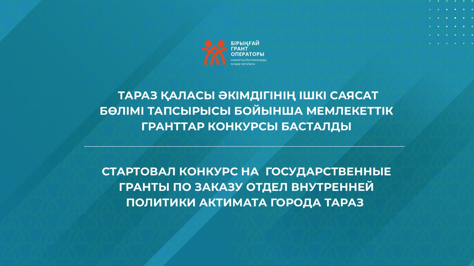 Тараз қаласы әкімдігінің Ішкі саясат бөлімінің тапсырысы бойынша үкіметтік емес ұйымдарды қысқа және орта мерзімді гранттар конкурсына қатысуға шақырамыз!