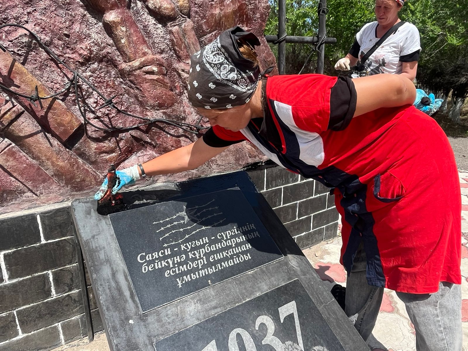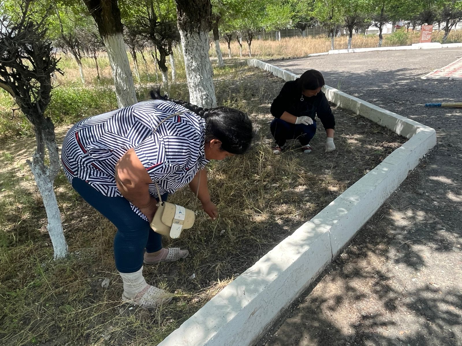 Жалпы тазалық жұмыстары көлемі 1 гектар алқапты жүргізіліп, ауланы тазалау, 15 ағаш және 10 бағана әктеліп, ескерткіш сырланды.