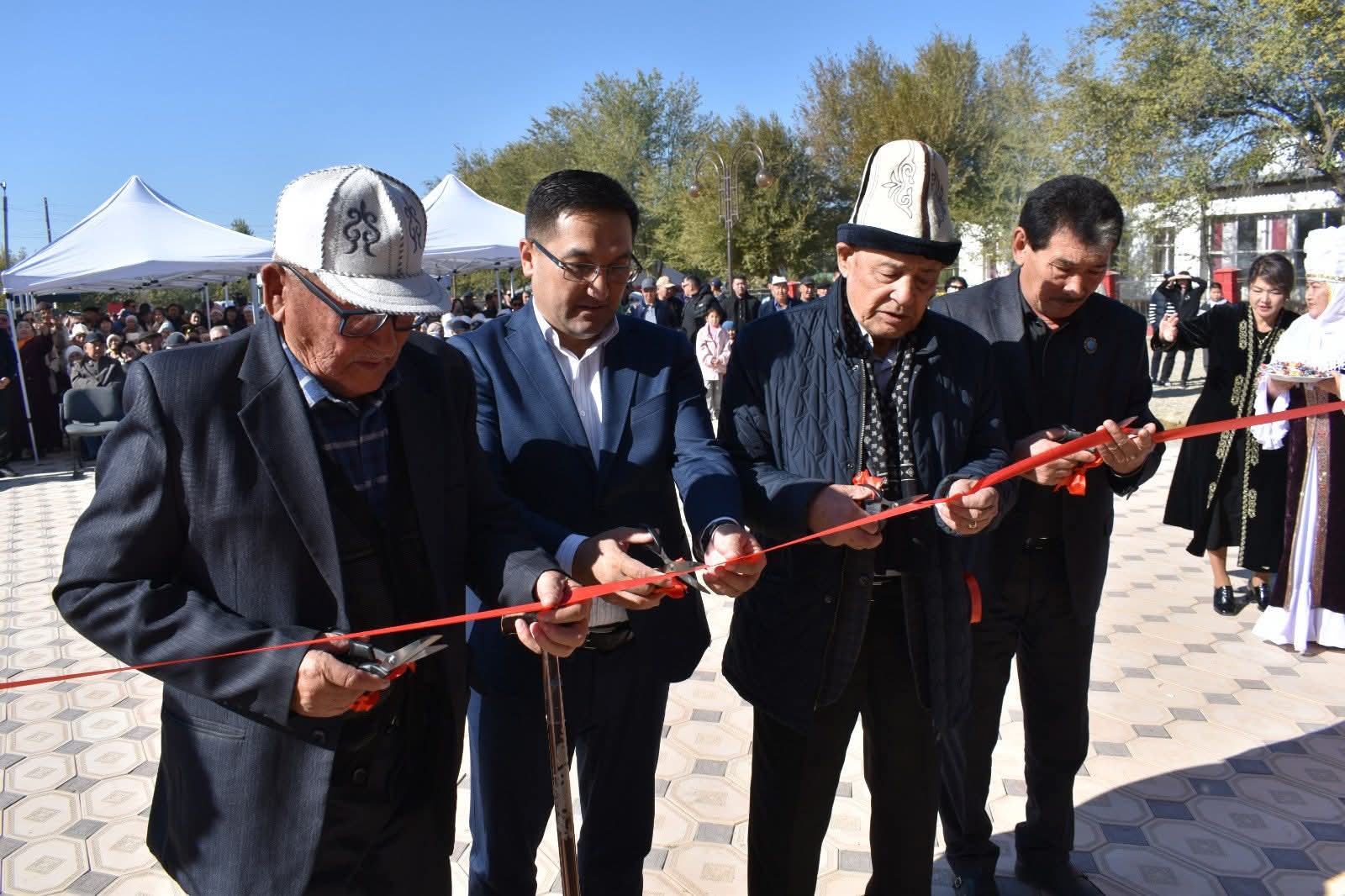 Жаңа сахнаның лентасын аудан әкімі Сәкен Мамытов, Сарысу ауданының құрметті азаматы Әбдіманап Көпберген, Қазақстан Республикасының құрметті депутаты Сағынбек Бегеев және Сарысу ауданының Құрметті азаматы Пернебек Алтынбеков салтанатты жағдайда қиды.