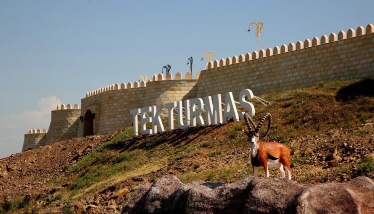 Ежелгі Тараз қаласының төл тарихын толығымен бейнелейтін «Тектұрмас» этнотарихи кешені Талас өзенінің жоғарғы жағалауында 24 гектар аумақты алып жатыр. Аталған тарихи кешен Тараз өңіріндегі ортағасырлық түркі елдерінің қасиетті мекенін көрсететін, түркі тарихынан сыр шертетін тарихнама ретінде әрі демалыс орны негізінде туризмді дамыту мақсатында салынған. Тарихи кешенді тамашалау Талас өзені арқылы өтетін көпірден басталады. Көпірге кіреберіс жерде екі үлкен стела тұрғызылған. Мұнда дөңгелек күн тәрізді тастың бірінші бетінде Ұлы Батыс түркі қағандарының таңбасы бейнеленсе, екінші бетінде Түркі халықтарының наным-сеніміндегі тәңір құсы Самұрық бейнесі көрсетілген. Ал көпір аяқталатын жерінің екі жағында түркі халықтарының негізгі айбарлы белгісіне айналған биіктігі 4 метрлік, салмағы 3 тонналық ақ түсті мәрмәр тастан құйылған, түр-келбеті қазба жұмыстары кезінде табылған артефакт бейнесі бойынша жасалған екі арыстанның мүсіндік бейнесі орнатылған. Сонымен қатар «Көне Тараз» қақпасы «Тектұрмас» этнотарихи кешенінің сәулетін арттырып тұр. Шығыс стилінде салынған қақпаның биіктігі – 10 метр, ені 14 метрді құрайды. Қақпаның екі жағында күзет тұратын биік мұнаралары бар, ортасындағы қасбеттері әртүрлі ою-өрнектермен безендірілген.