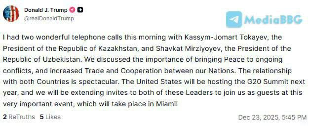 США будут принимать саммит G20 в следующем году, и мы пригласим лидера присоединиться к нам в качестве гостей на этом очень важном мероприятии, которое пройдет в Майами», — написал президент США.