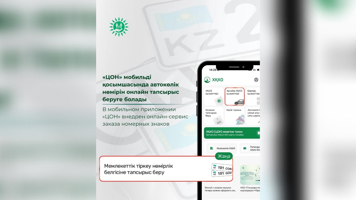 «Азаматтарға арналған үкімет» Мемлекеттік корпорациясы «ЦОН» мобильді қосымшасында жаңа цифрлық қызмет іске қосылғанын хабарлады. Енді қазақстандықтар автокөлікке арналған мемлекеттік нөмірді онлайн таңдап, тапсырыс бере алады.