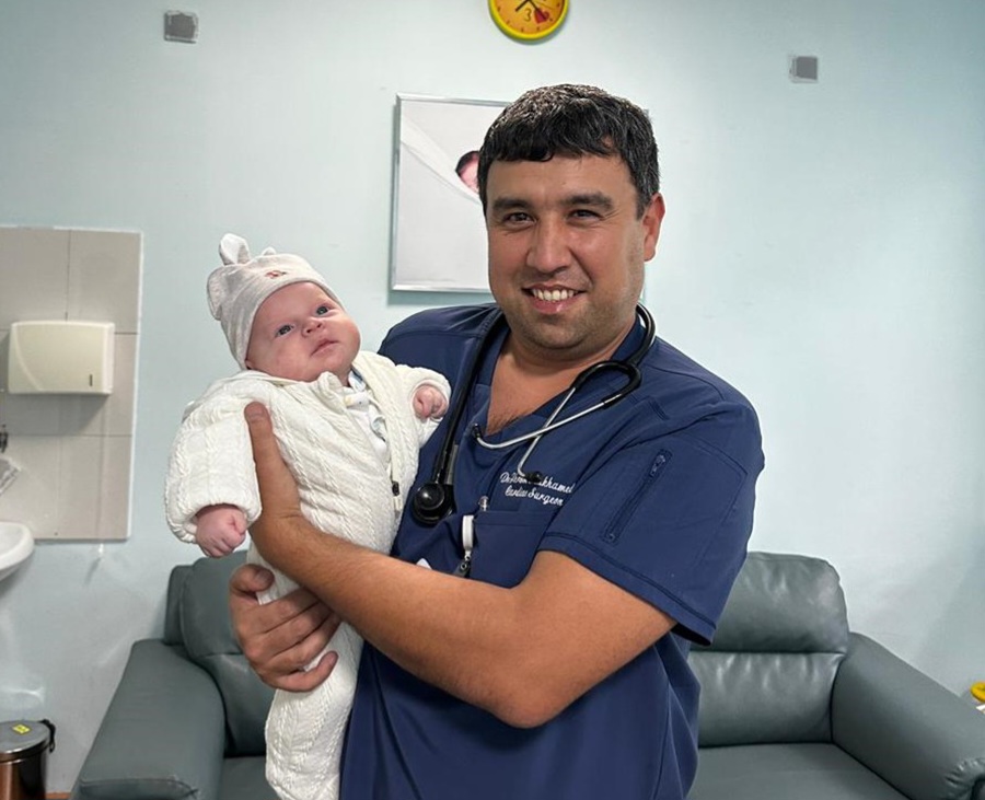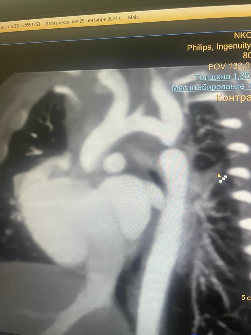 Впервые в Таразе 8-дневному новорожденному с критическим врожденным пороком сердца сделали экстренную операцию в Научно-клиническом центре кардиохирургии и трансплантологии (НКЦКТ) с диагнозом Критическая коарктация аорты. Новорожденный Г. в возрасте 8 дней, из города Тараз, поступил в НКЦКТ в крайне тяжелом состоянии, с жалобами на выраженную одышку в покое с ЧД 80 в минуту, синюшность кожных покровов, отсутствие мочи, сатурация кислорода 60%. Со слов мамы о пороке стало известно на втором триместре обследования УЗИ скрининг плода. В роддоме ОПЦ был выставлен предварительный диагноз ВПС Коарктация аорты. На 8 день жизни, учитывая критические жалобы обратились в городскую детскую больницу, оттуда направлен в НКЦКТ, где специалистами Центра проведено ЭХОКГ, КТ с контрастированием, диагноз подтвержден: Критическая коарктация аорты. Решением консилиума, в составе зав. детским кардиохирургическим отделением Мухамедовым Икромом, зав. реанимации Розбаевым Зафаром и детским кардиологом Уколовой Юлией, в 5 утра 8.10.2023 г. была выполнена по жизненным показаниям экстренная операция: резекция критической коарктации аорты с наложением протяженного анастомоза в «конец в конец».