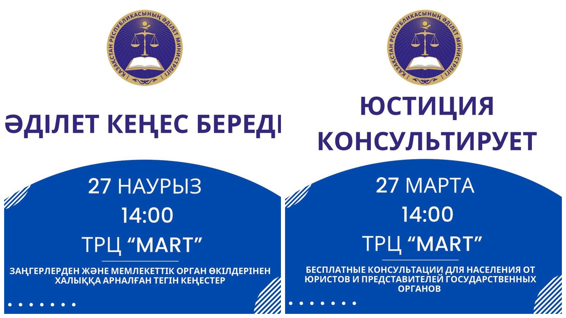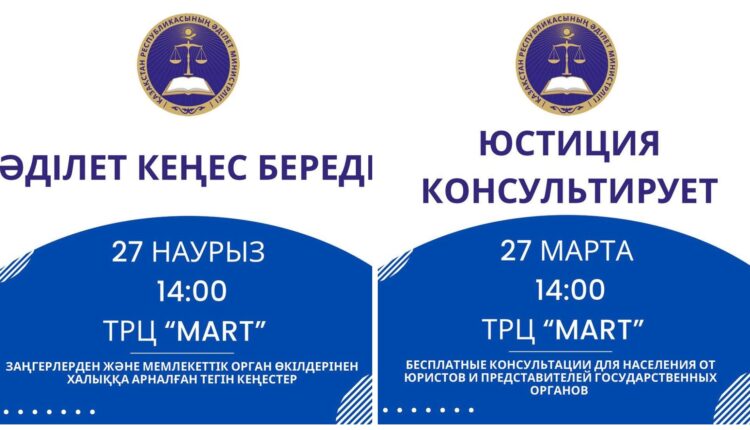В городе Тараз 27 марта 2026 года состоится акция «Юстиция консультирует», направленная на оказание бесплатной юридической помощи гражданам.