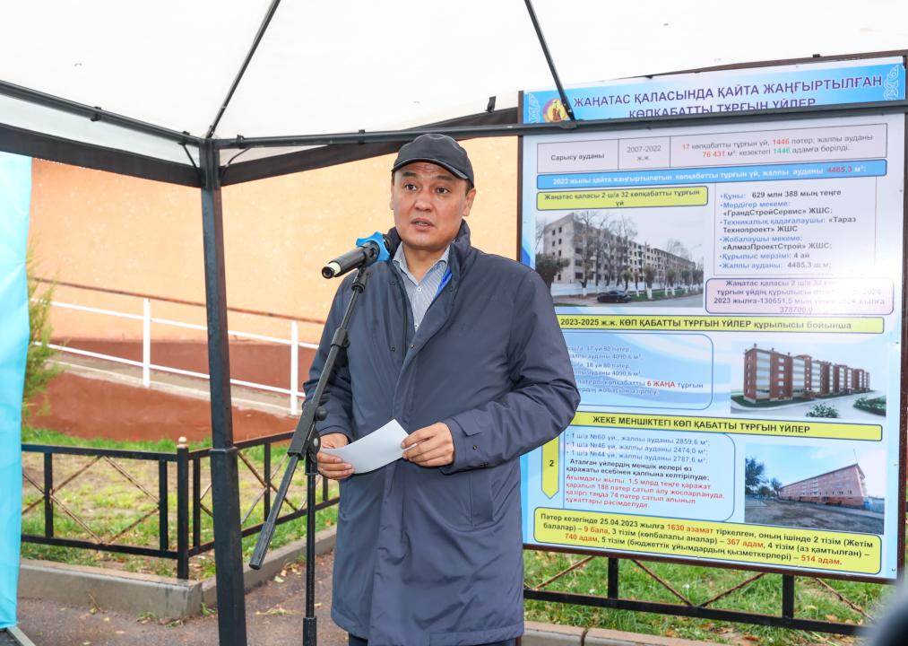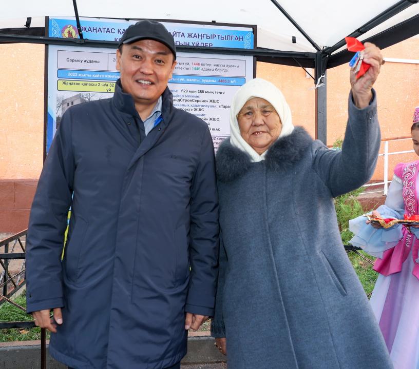 Жамбыл облысының әкімі Ербол Қарашөкеев Сарысу ауданына жұмыс сапары барысында Жаңатас қаласындағы 1 шағын аудан, №60 үйдің кілтін тұрғындарға табыстау рәсіміне қатысты.