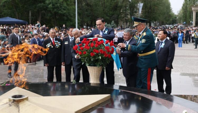 Жамбыл облысының әкімі Ербол Қарашөкеев Бауыржан Момышұлы атындағы «Жеңіс» саябағында Мәңгілік алауға гүл шоқтарын қою рәсіміне қатысты.